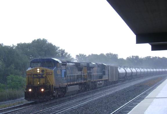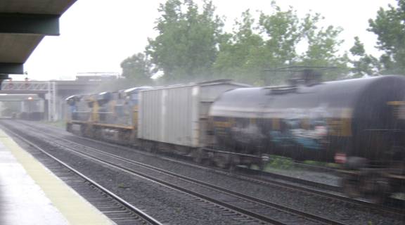 I then heard thunder and it started to pour rain. However, I was under cover so I didn’t get soaked. I photographed a westbound freight that had two engines, a covered hopper, a whole lot of tank cars, and then one more covered hopper as it raced by.