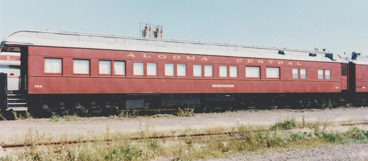 These cars can be modelled in HO using Walthers' Troop Sleeper. Micro-Trains has a Troop Sleeper in N scale. The two windows on either side of the entrance door on the model with have to be filled in and a new opening for the baggage door cut around the original entrance door in the side of the car. Algoma Central passenger car decals are available from Black Cat Decals.