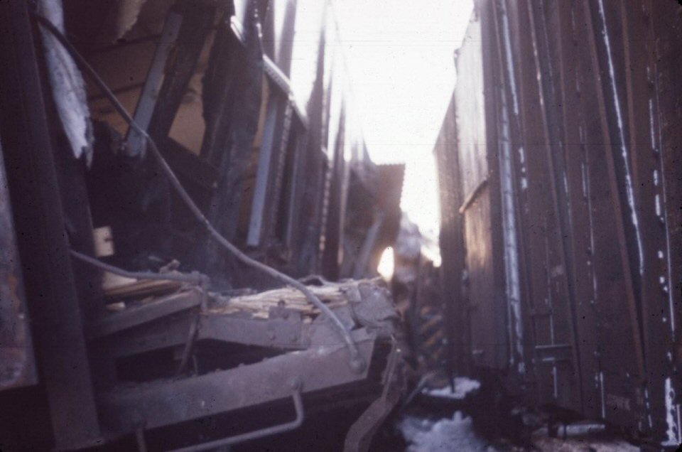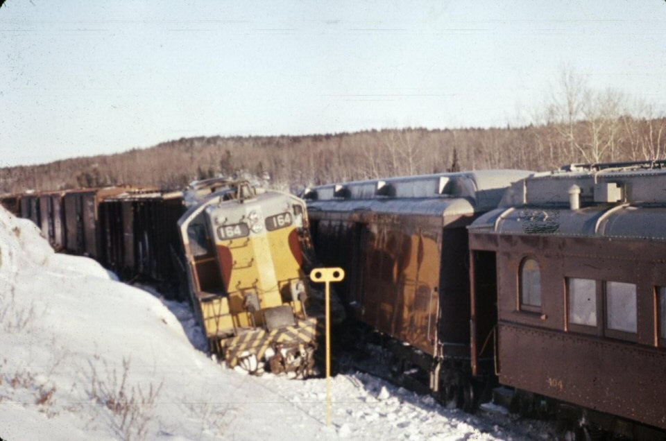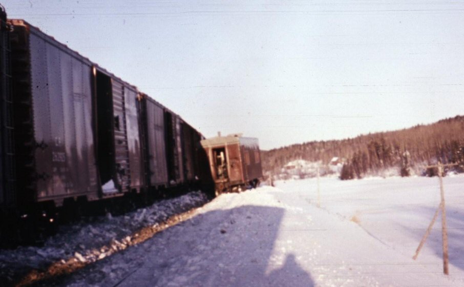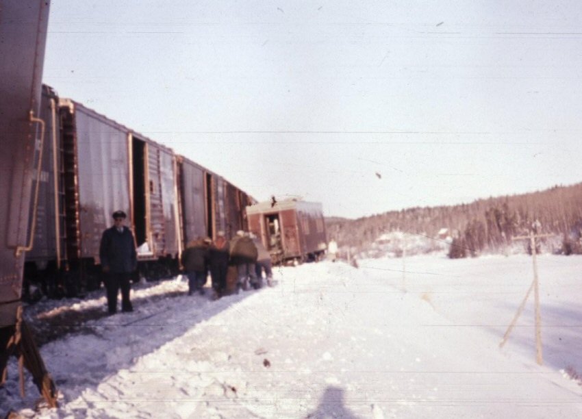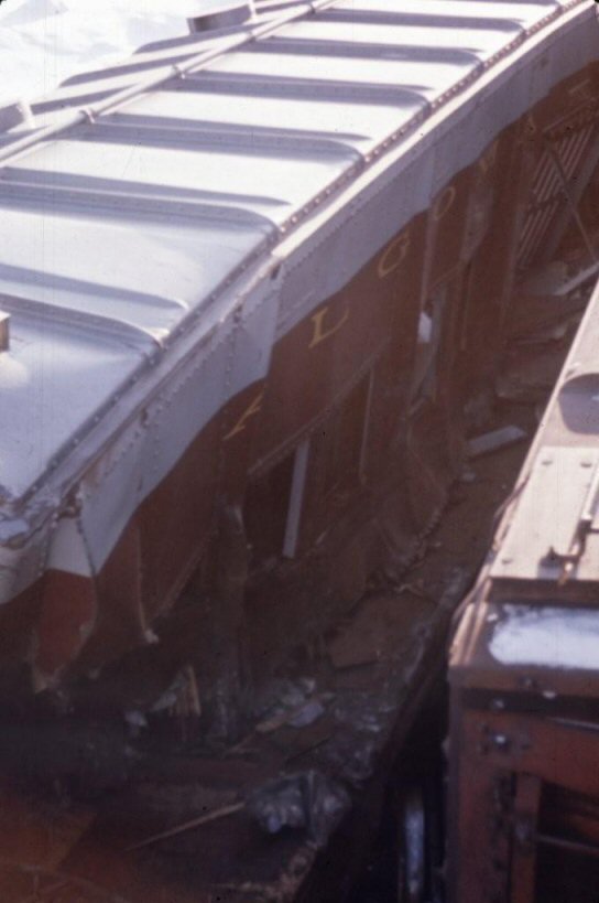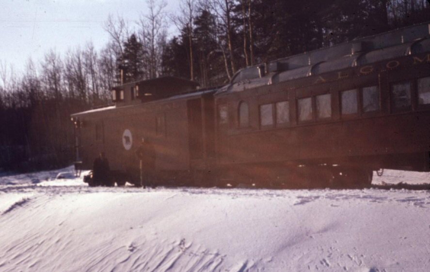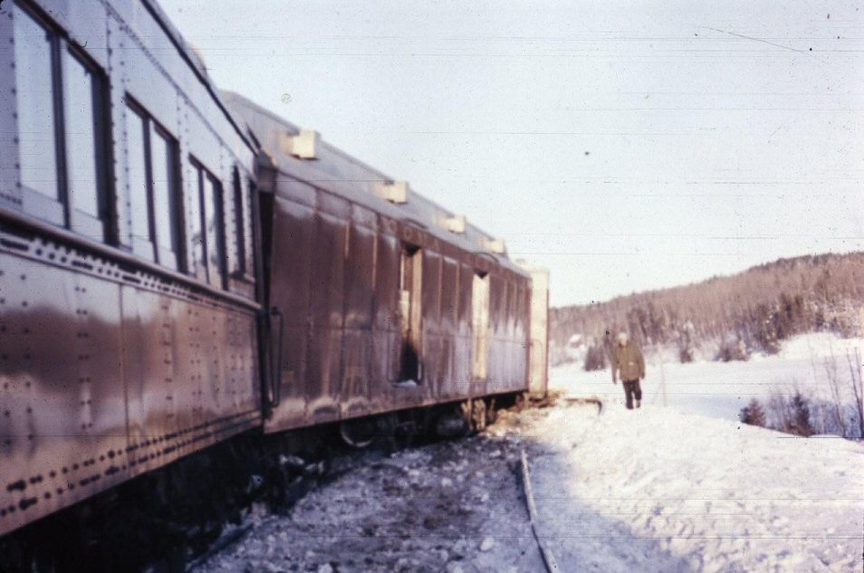 This series of shots shows the aftermath of an incident at Franz during the winter of 1964 involving the northbound passenger train and a southbound freight. Notice the "caboose" on the end of the passenger train; this is actually the AC's flanger #10120. The siding at Franz was later extended in 1966. Franz 1964 Steve Dent