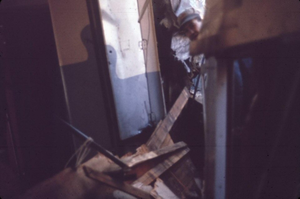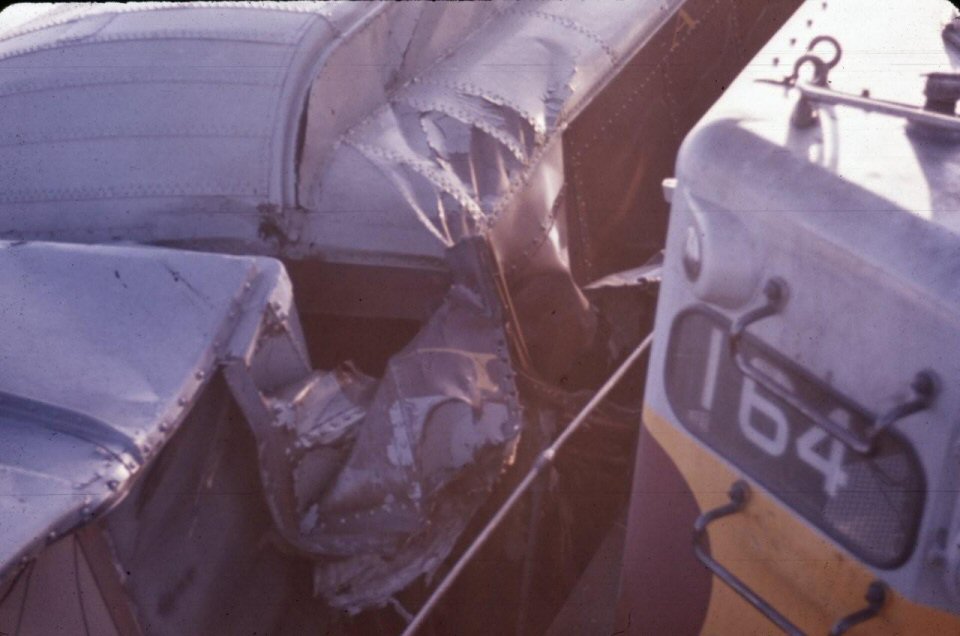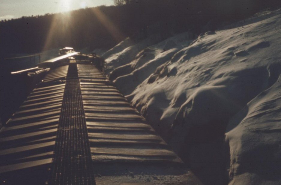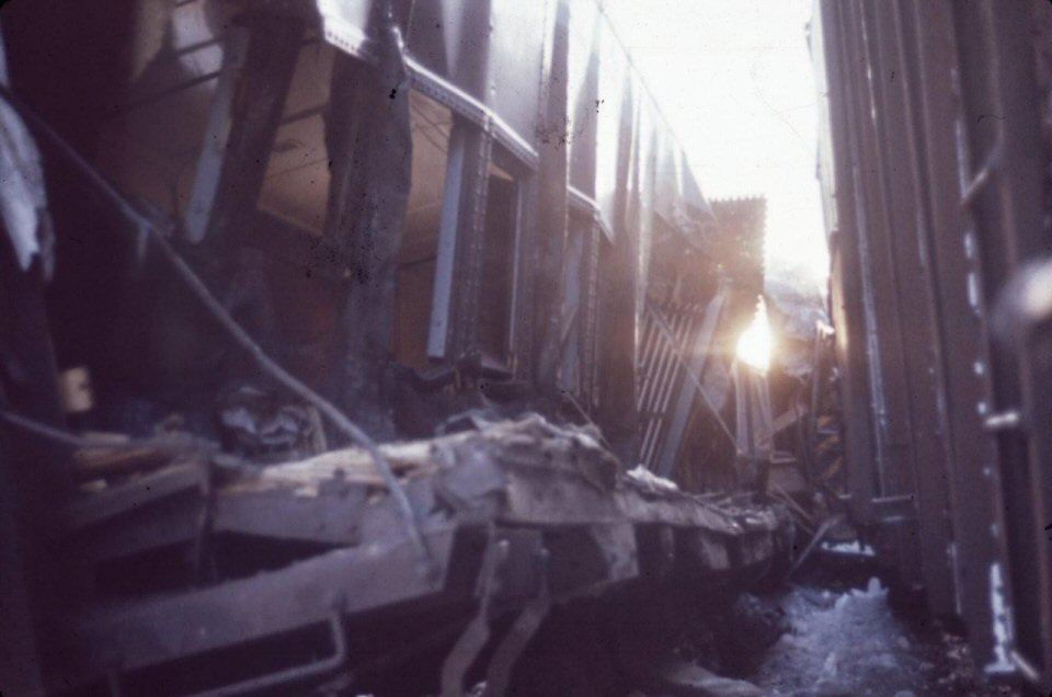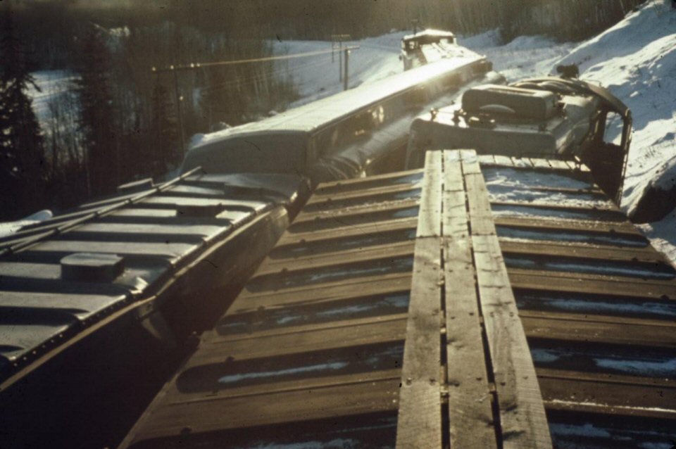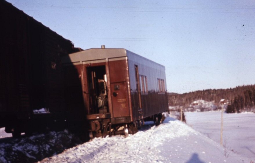 This series of shots shows the aftermath of an incident at Franz during the winter of 1964 involving the northbound passenger train and a southbound freight. Notice the "caboose" on the end of the passenger train; this is actually the AC's flanger #10120. The siding at Franz was later extended in 1966. Franz 1964 Steve Dent