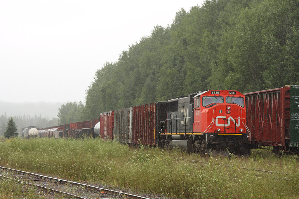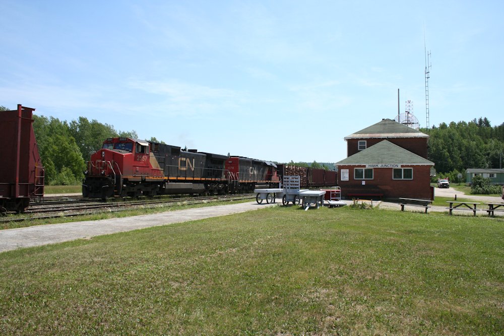 The regular northbound freight over the line, CN L571, switches at Hawk Junction after meeting the southbound passenger train. Hawk Junction 2013 Chris vanderHeide
