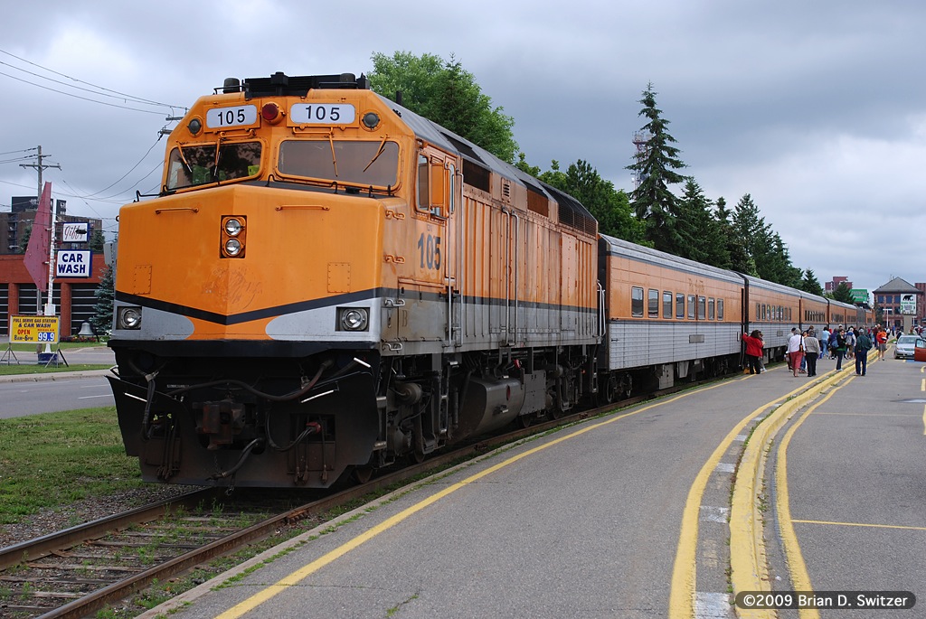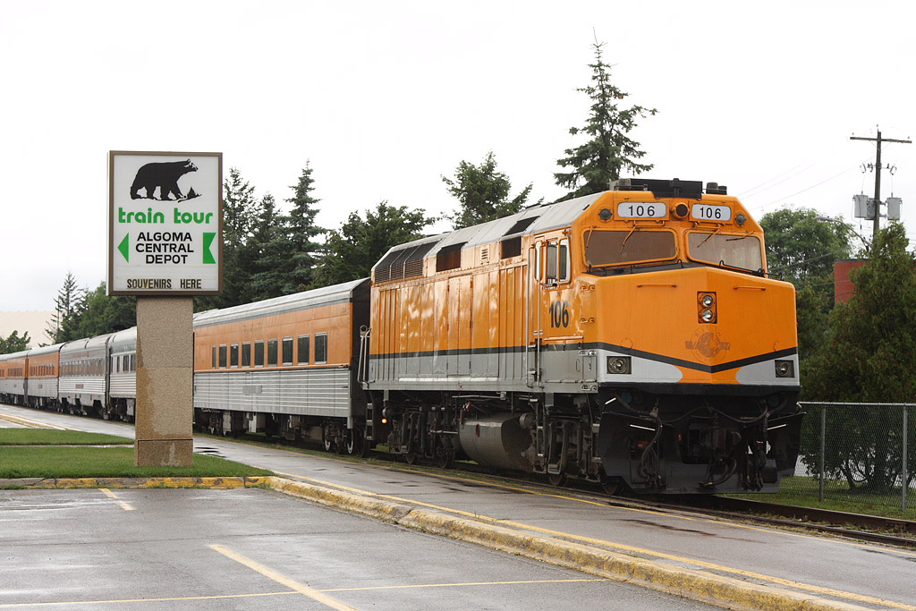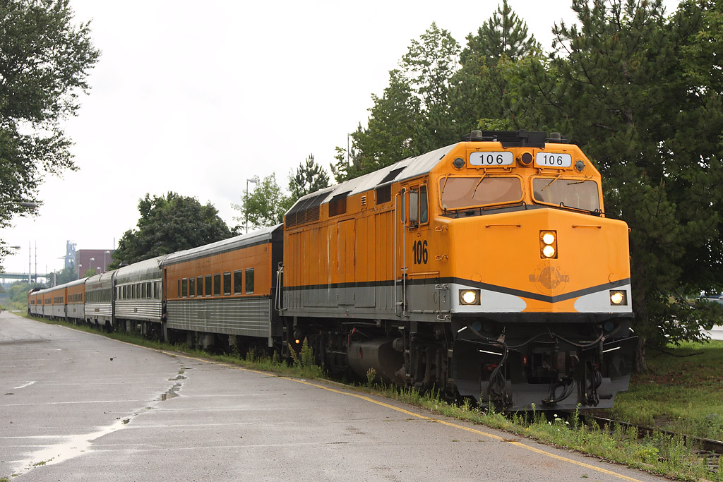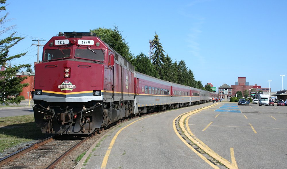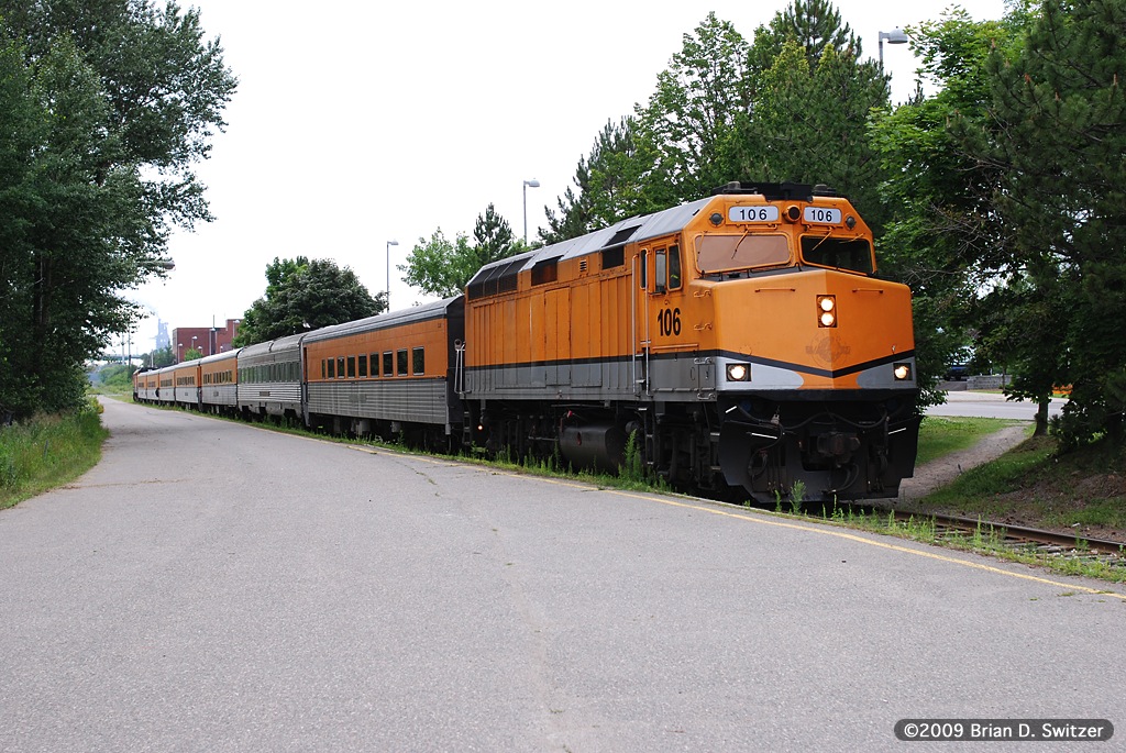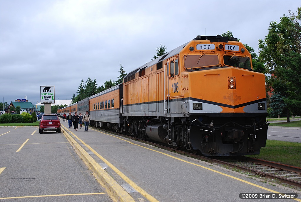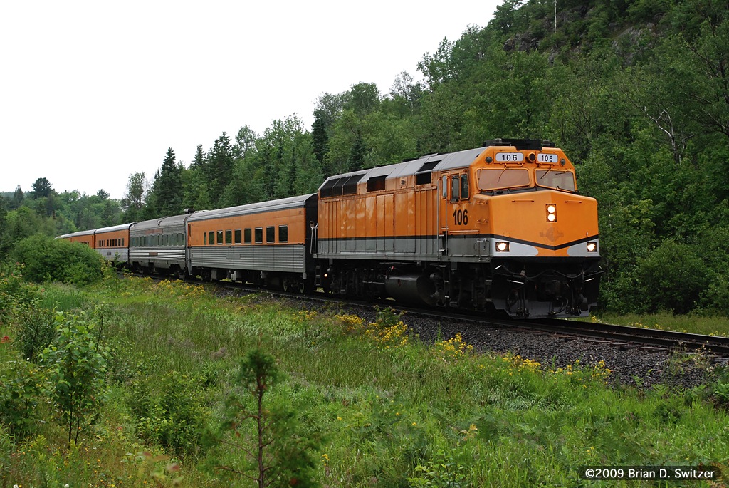 An 7-car (6 coaches, one diner) Agawa Canyon Tour Train returns to Sault Ste. Marie with CN 105 & 106. Sault Ste. Marie 2009 Brian Switzer