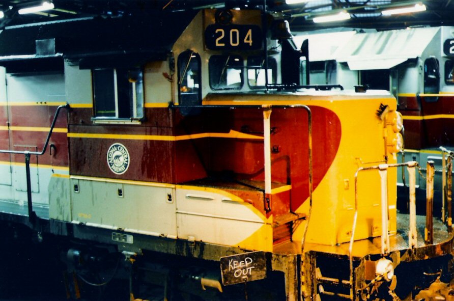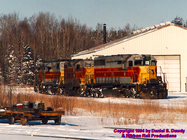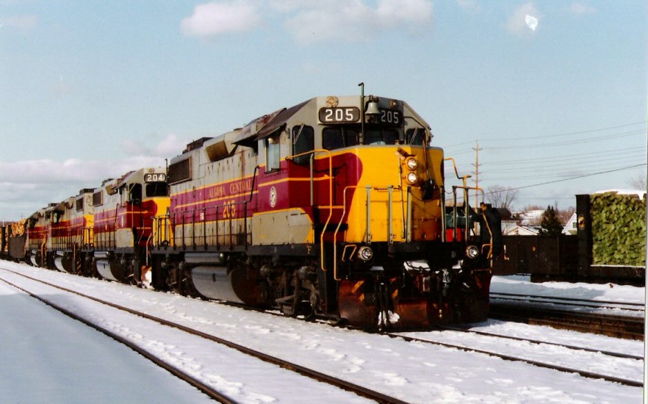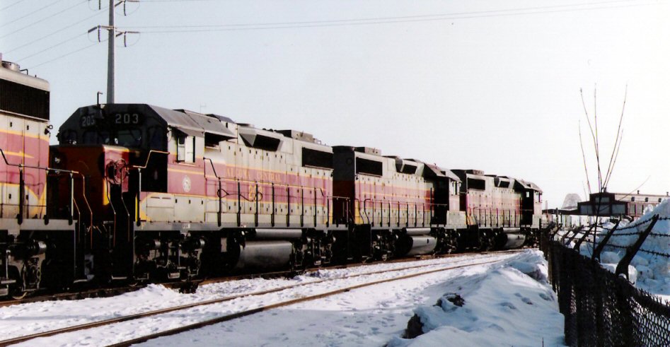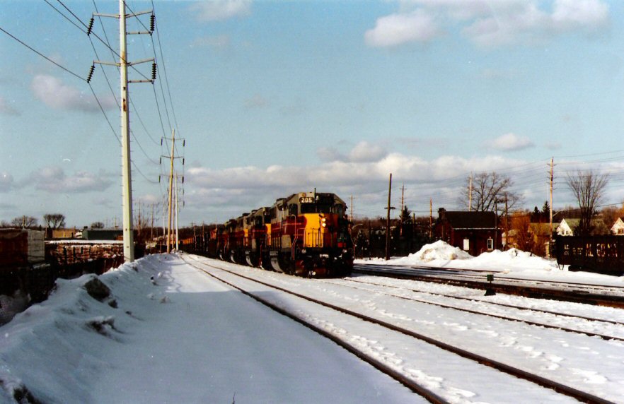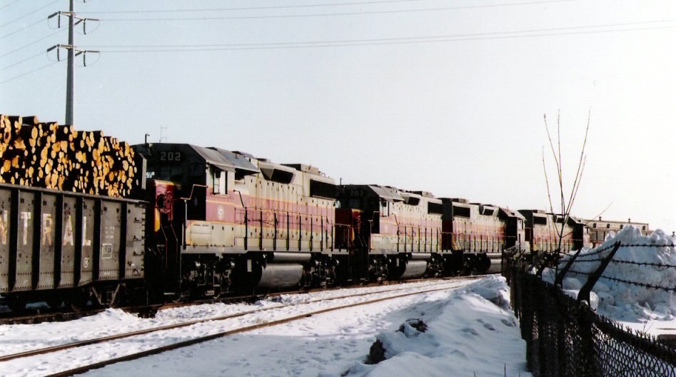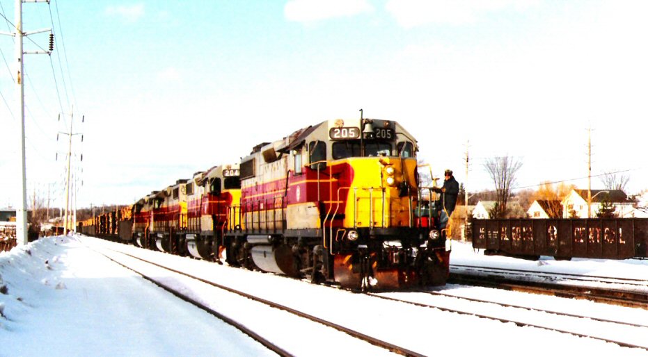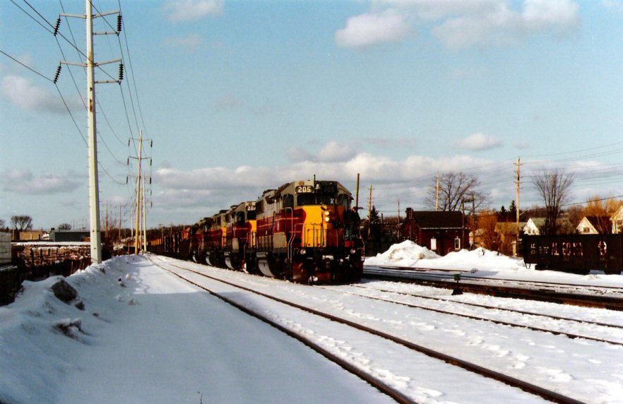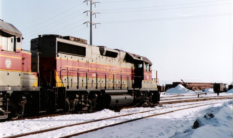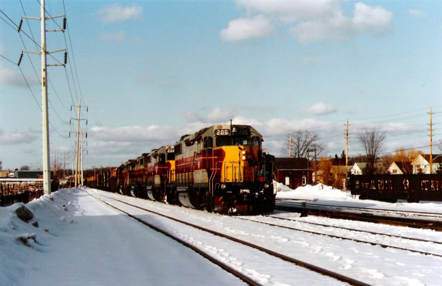 Virtual railfanning! This long sequence of photos shows 4 of the ACR's 6 GP38-2s (consisted in sequential order: 205, 204, 203, 202) bringing a long train of pulpwood into Sault Ste. Marie. Sault Ste. Marie 1995 Morgan Turney