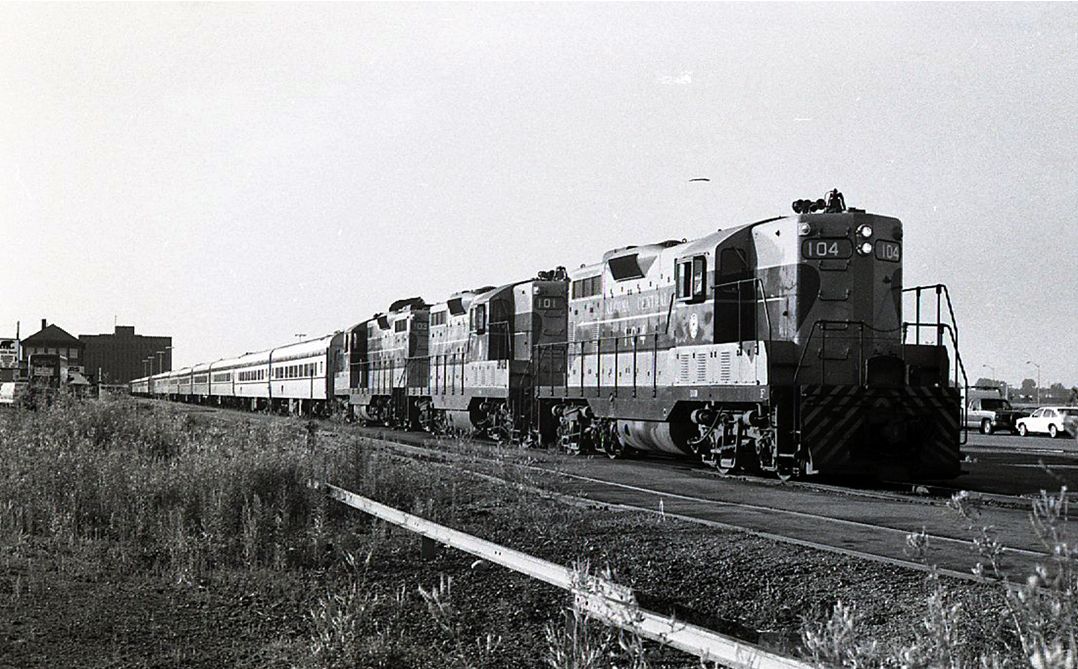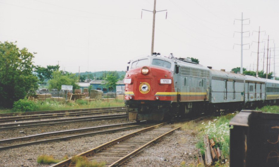 The southbound Agawa Canyon Tour Train arriving in Steelton, with a trio of Fs on the head end. Sault Ste. Marie 1996 Blair Smith