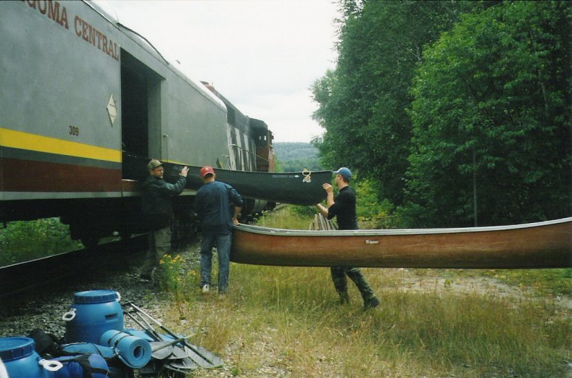 Passenger Loading canoes into the baggage car at Batchewana. Batchewana 2004 Mark Becker