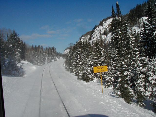Agawa Mile Board This scenic winter shot includes one of the markers that tells crews (and passengers) that a station or siding is coming up in the next mile. This one is near Agawa, roughly halfway between Canyon and Hawk Junction 1 mile from Agawa 2001 Richard Schivley