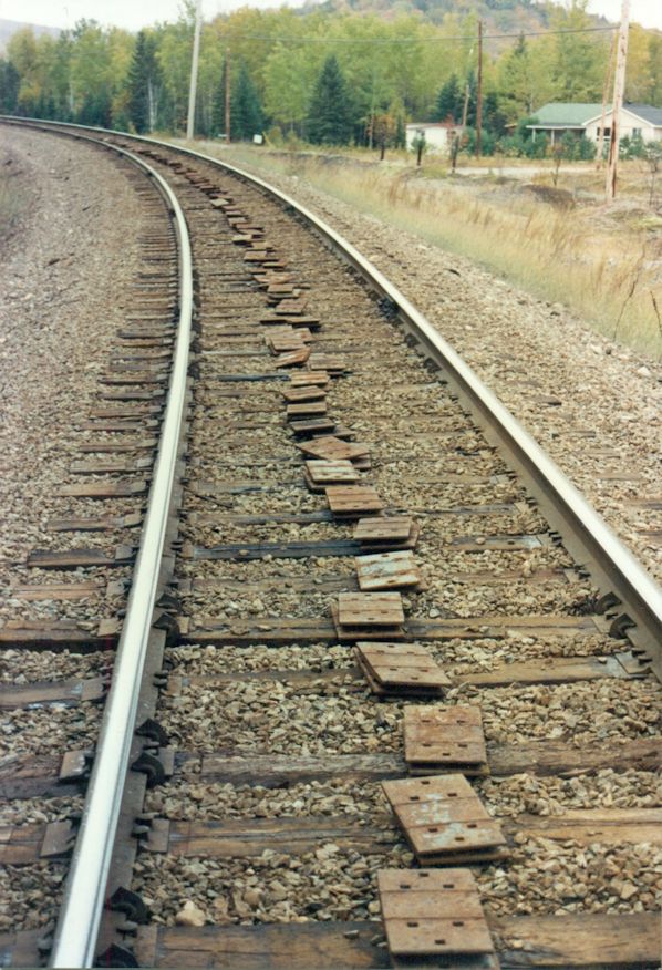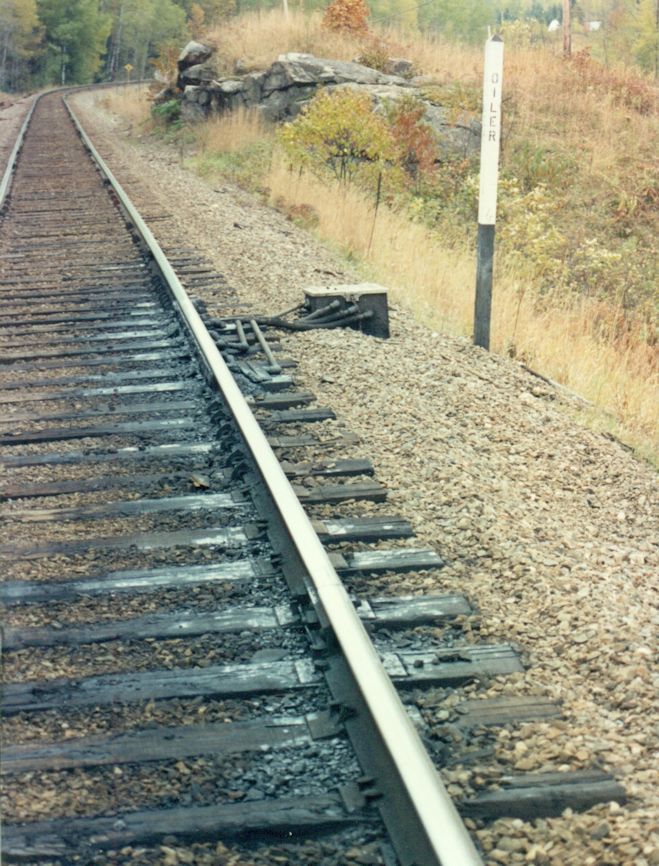 Flange Oiler With tight and constant curvature found on the southern part of the Algoma Central, flange oilers were extensively used. This one is located just south of Searchmont. Searchmont Aug 1993 Blair Smith