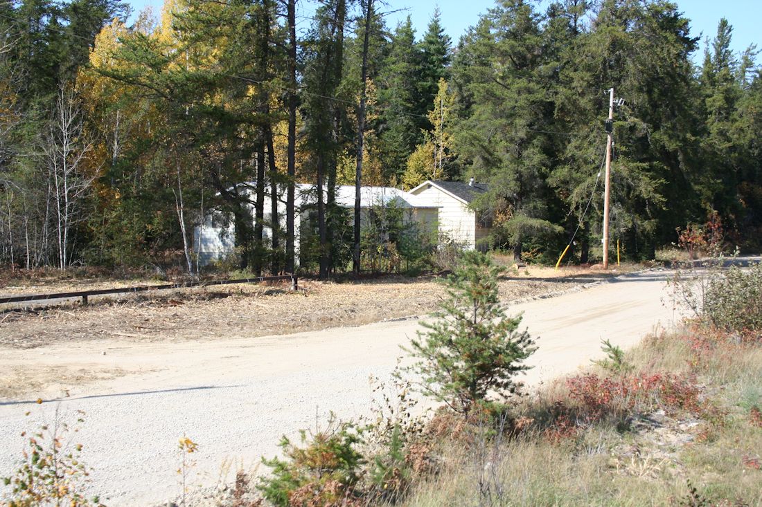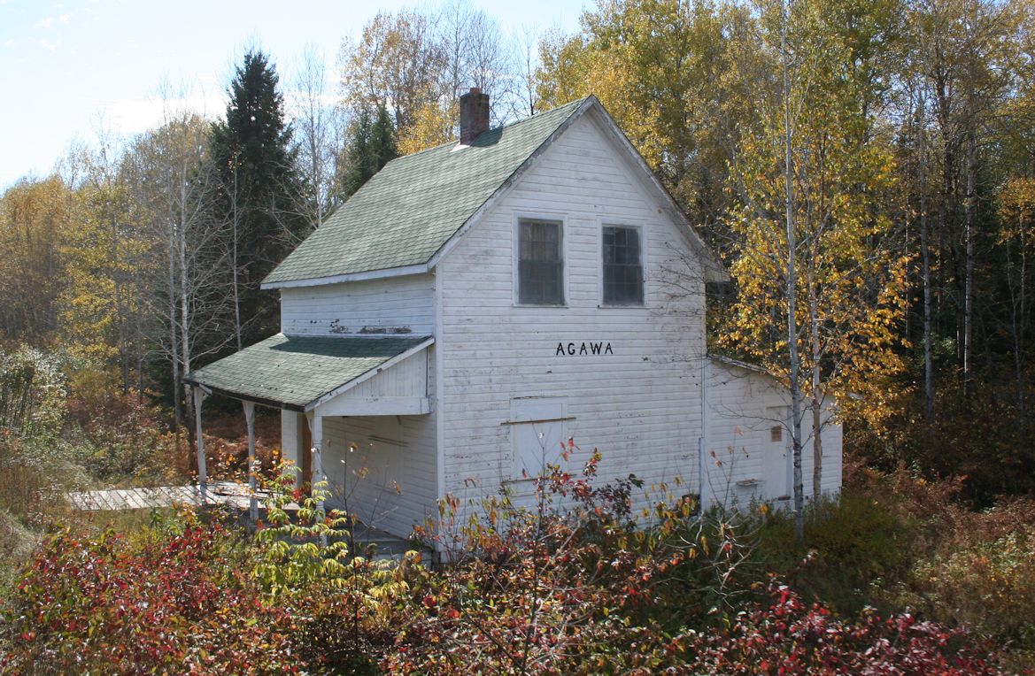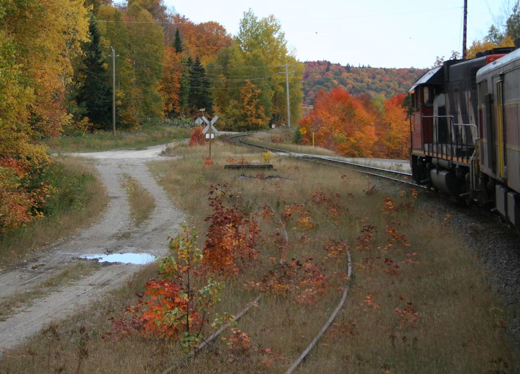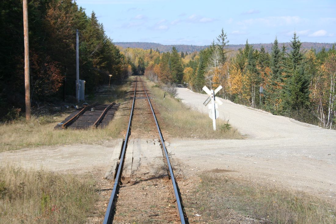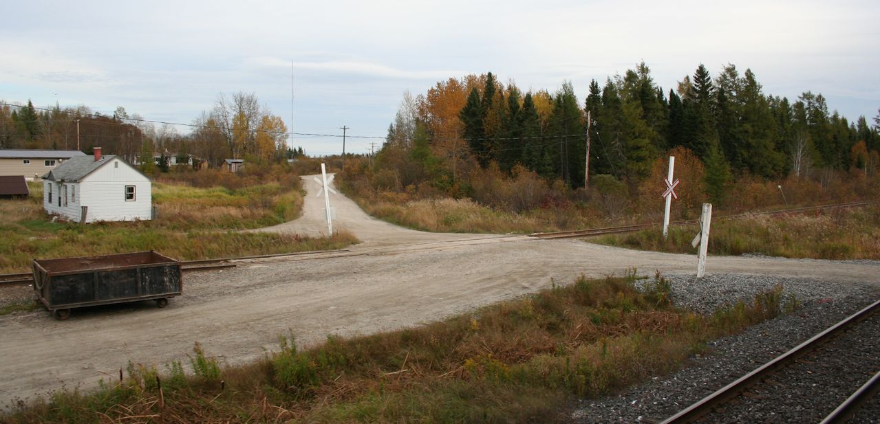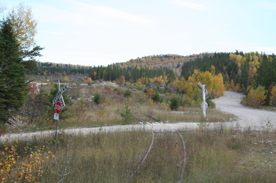 Crossing Private crossing of a logging road at Mosher. Longer ties marking the former location of the north spur are visible just beyond the crossing and the station and siding are clearly visible in the background. Looking northward. Mosher Oct. 2013 Chris vanderHeide