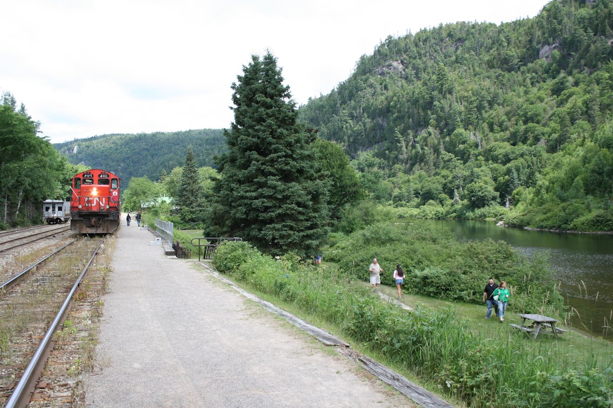 The southbound regular passenger train stops to pick up a group of canoers at Hawk Junction. Hawk Junction 2013 Chris vanderHeide