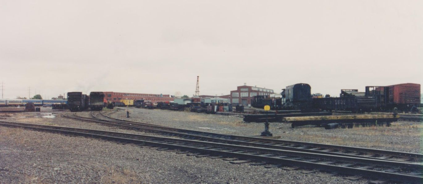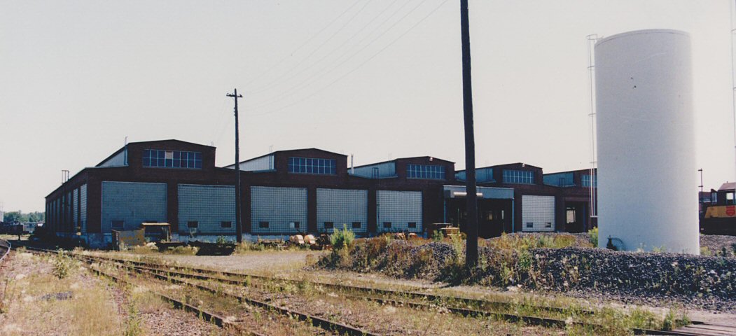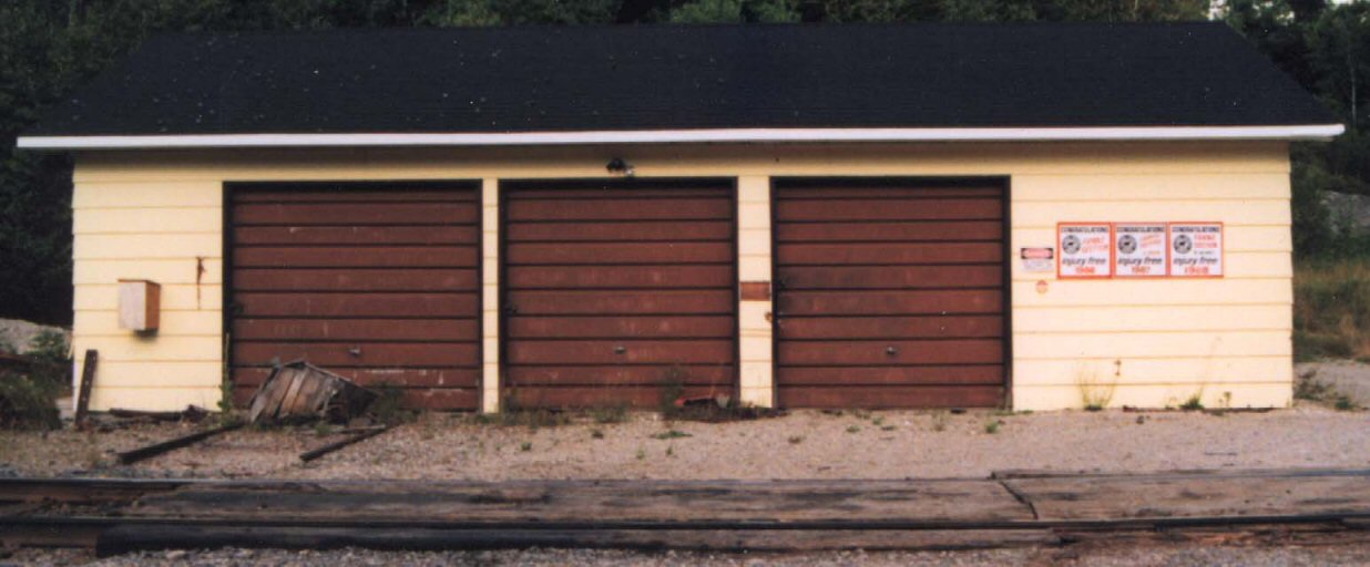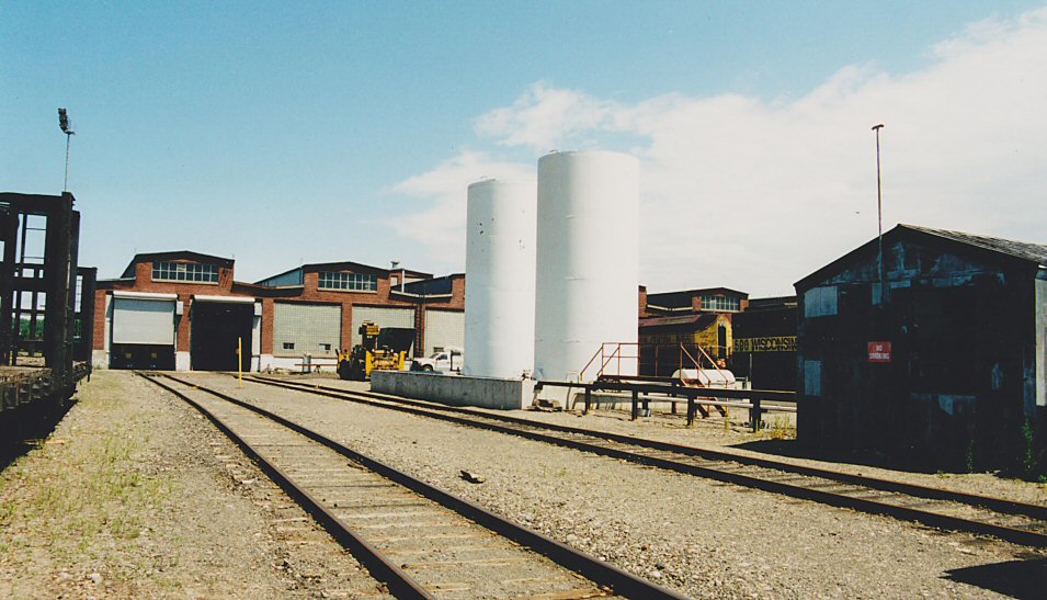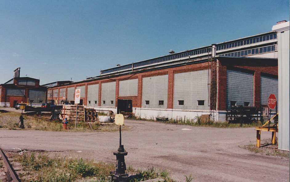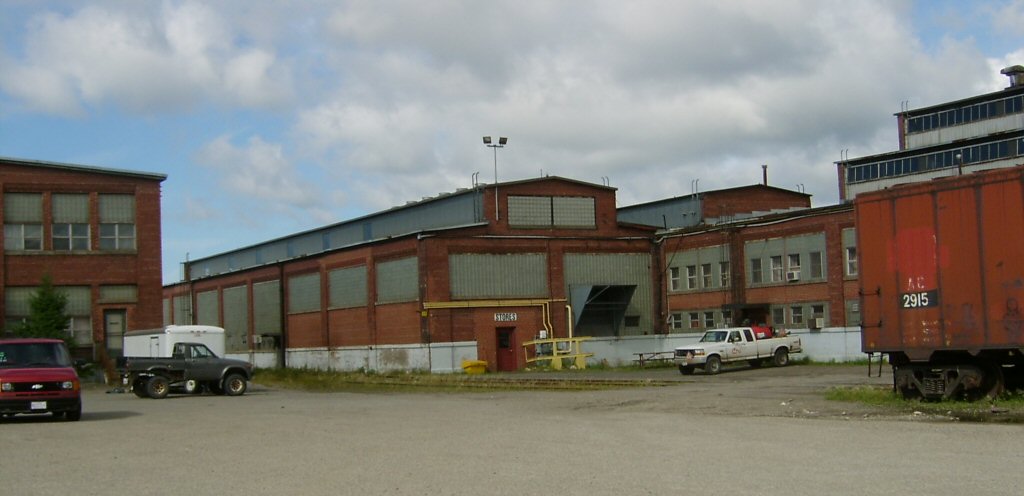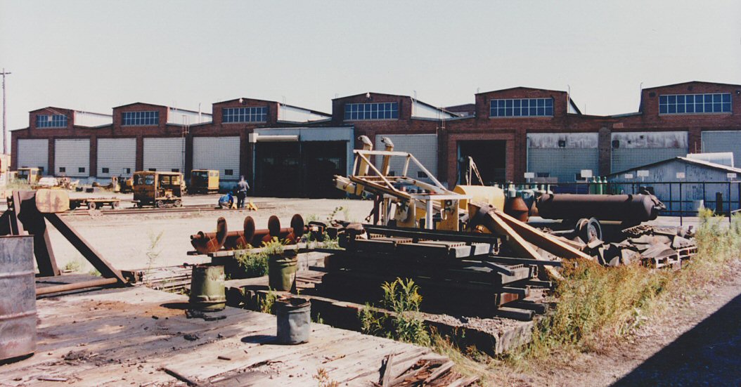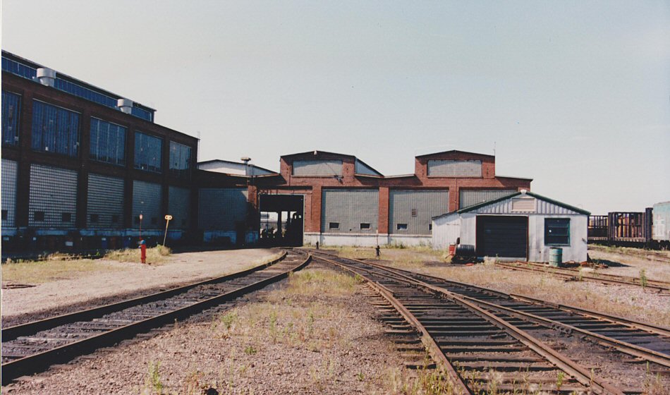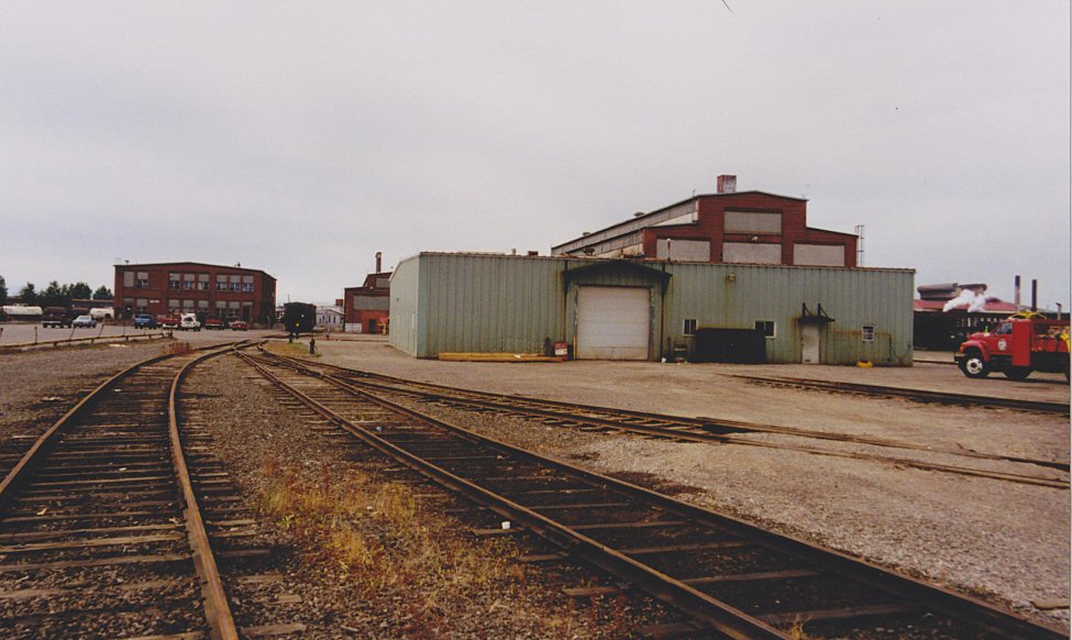 Workshop Workshop building in front of the enginehouse and car shops buildings, alongside the passenger coach tracks. Shot from the tour train passing through the yard. Sault Ste. Marie 1996 Blair Smith