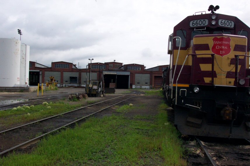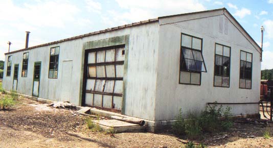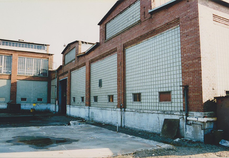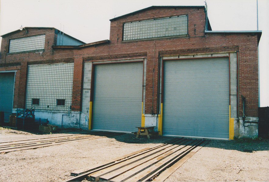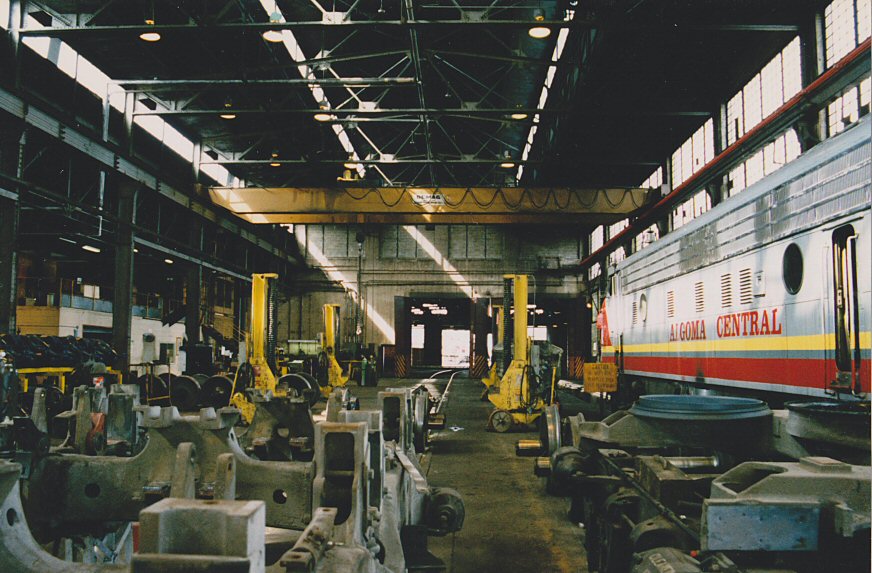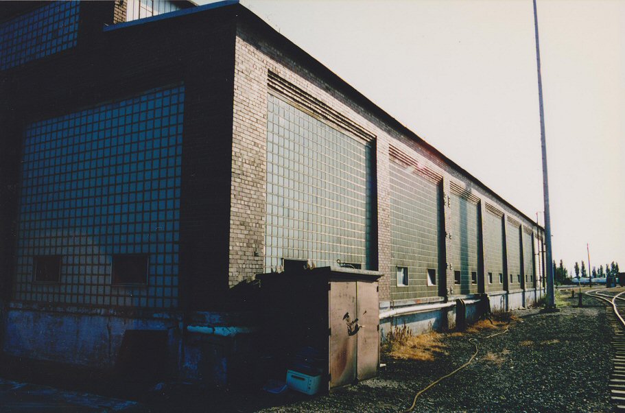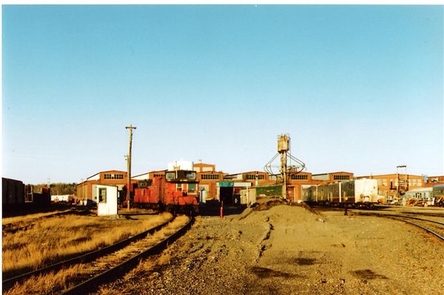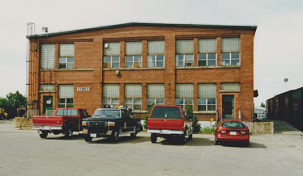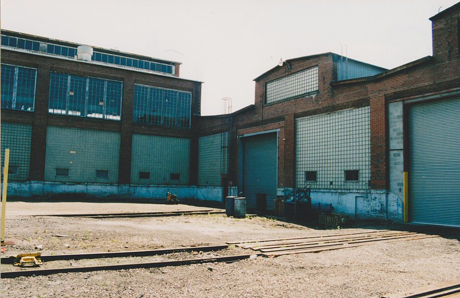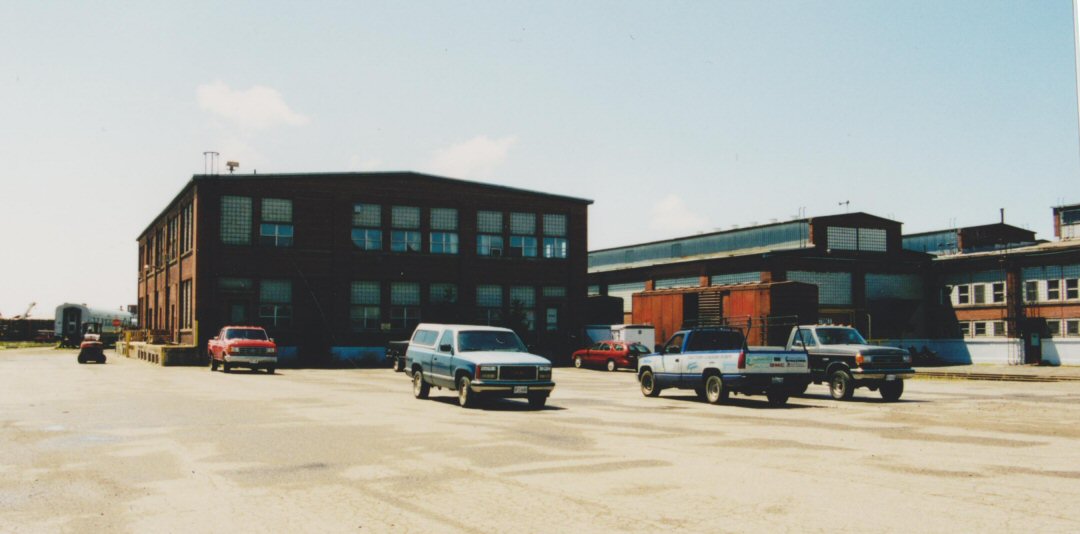 Workshop Workshop building in front of the enginehouse and car shops buildings, alongside the passenger coach tracks. Shot from the tour train passing through the yard. Sault Ste. Marie 1996 Blair Smith