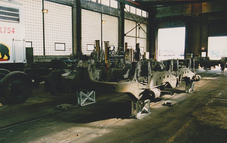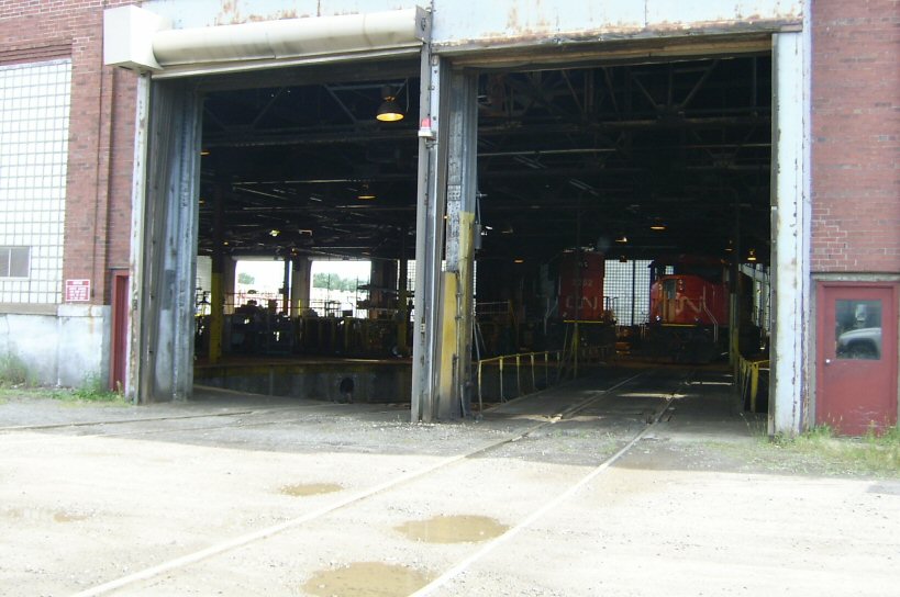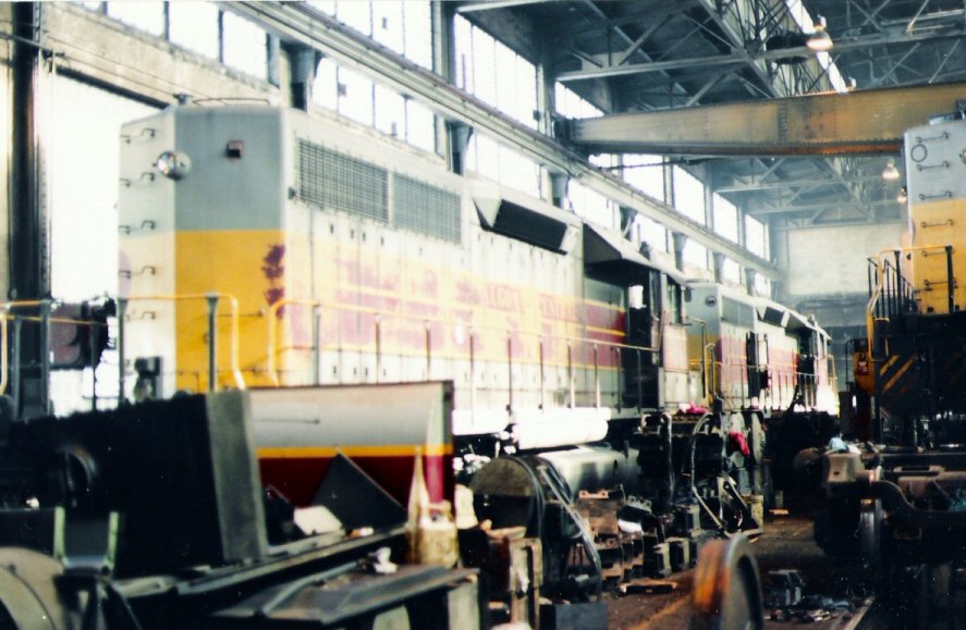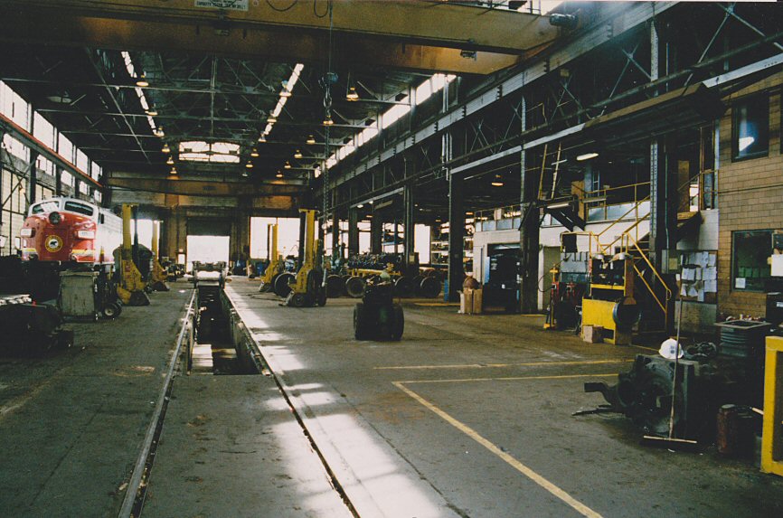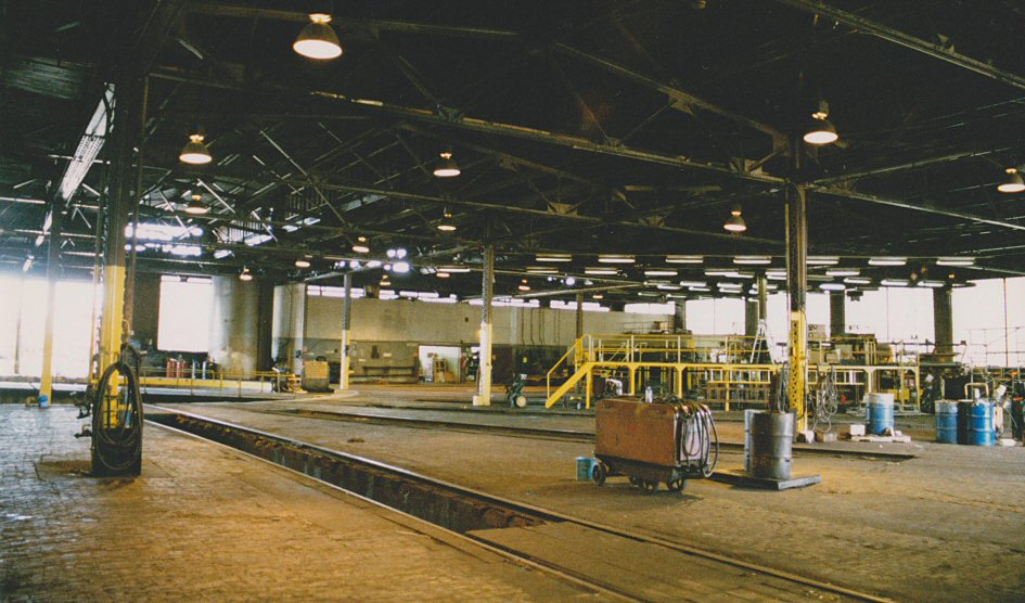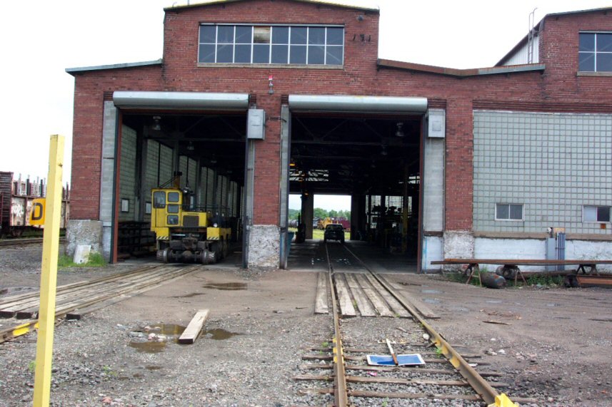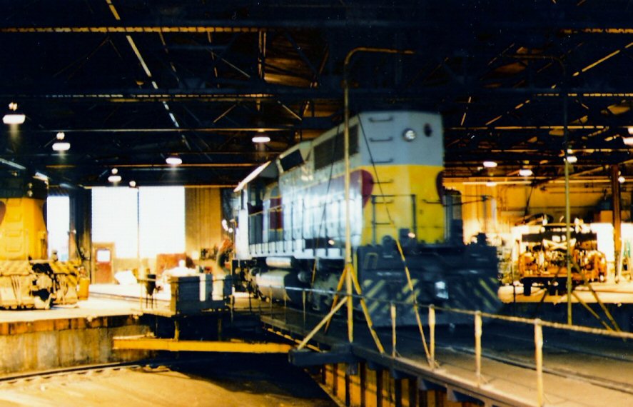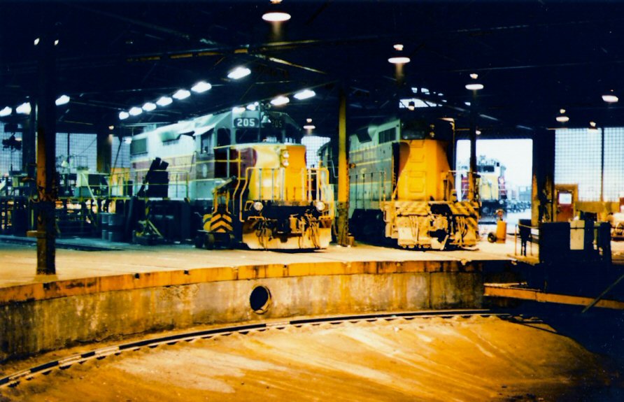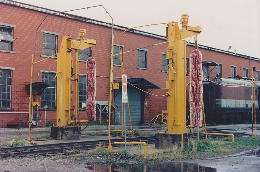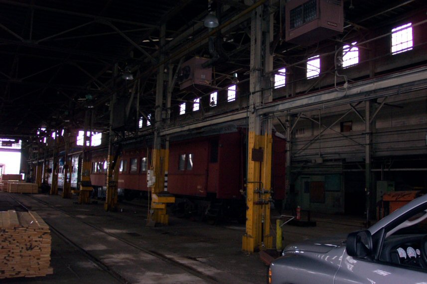 Workshop Workshop building in front of the enginehouse and car shops buildings, alongside the passenger coach tracks. Shot from the tour train passing through the yard. Sault Ste. Marie 1996 Blair Smith