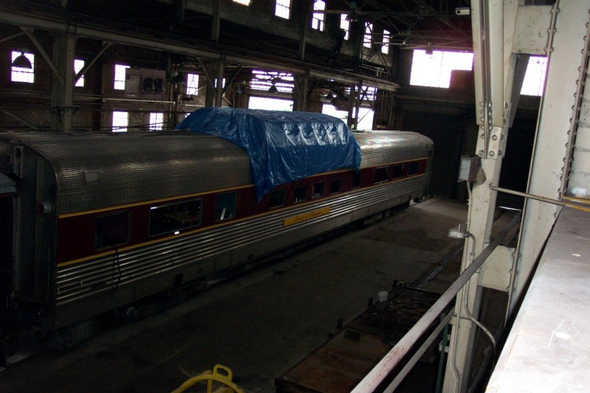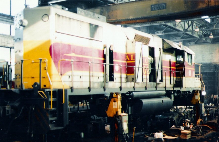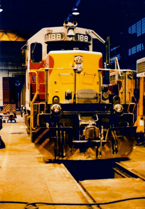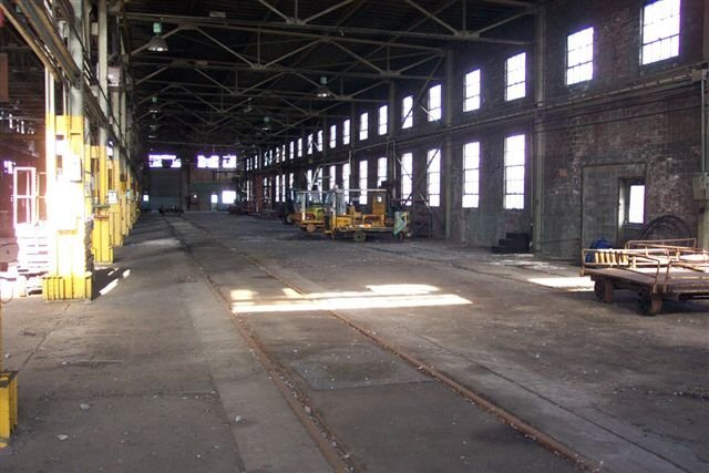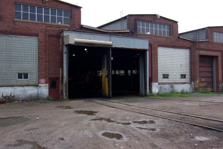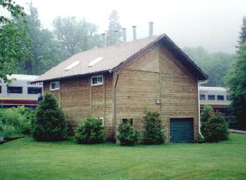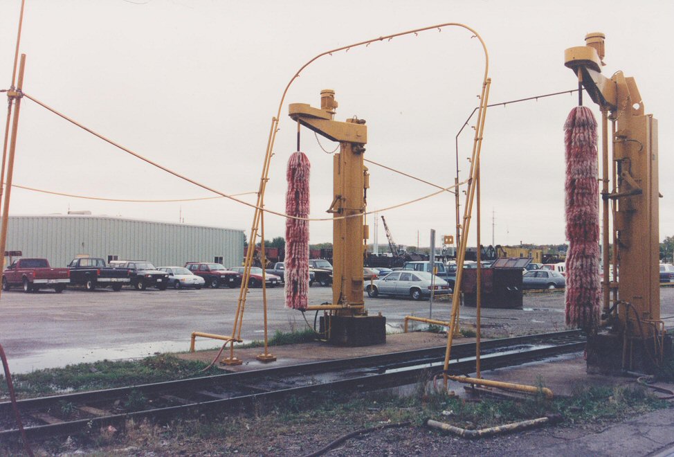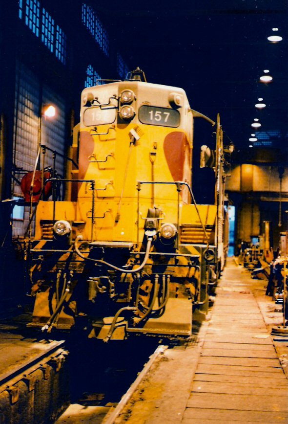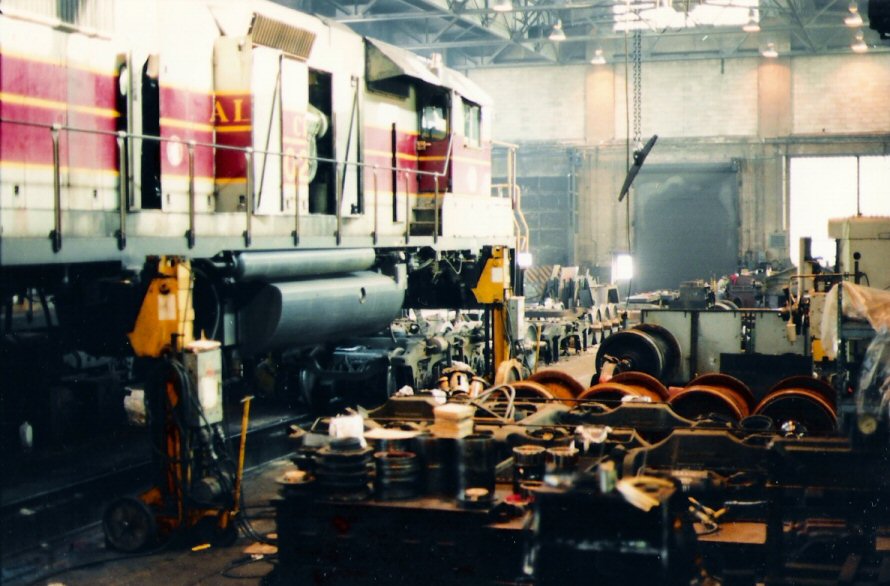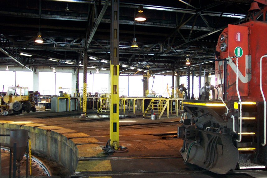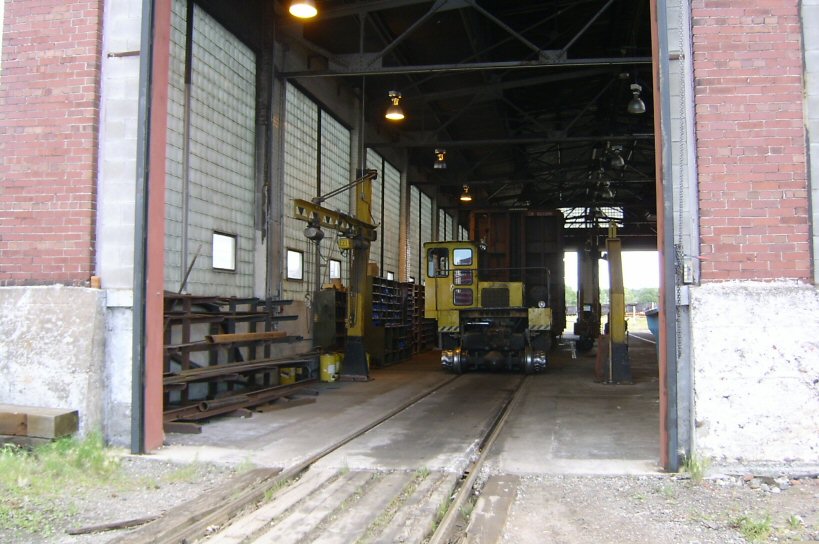 Workshop Workshop building in front of the enginehouse and car shops buildings, alongside the passenger coach tracks. Shot from the tour train passing through the yard. Sault Ste. Marie 1996 Blair Smith