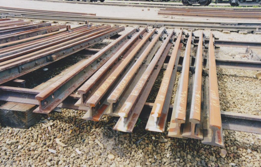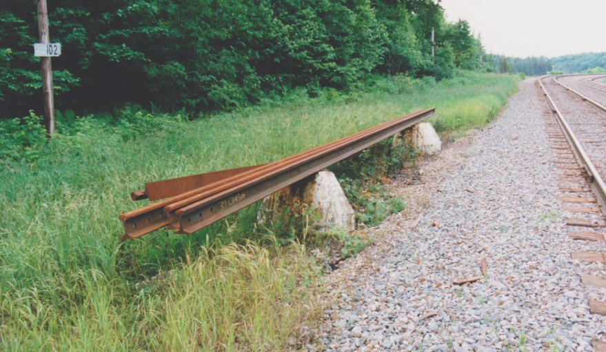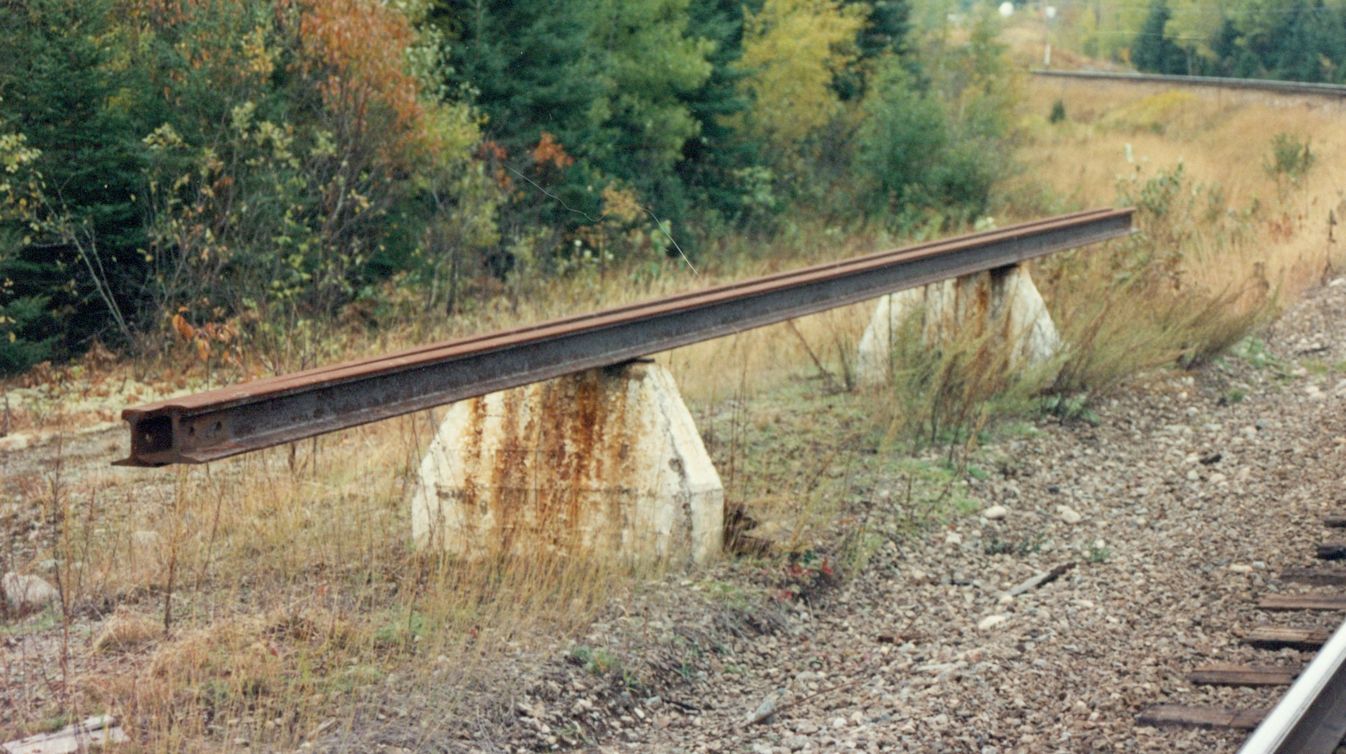 Spare pieces of rail are stored on concrete blocks at various places along the line. First photo is at Frater, second photo is at Searchmont. Blair Smith