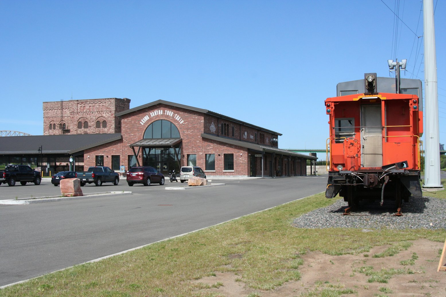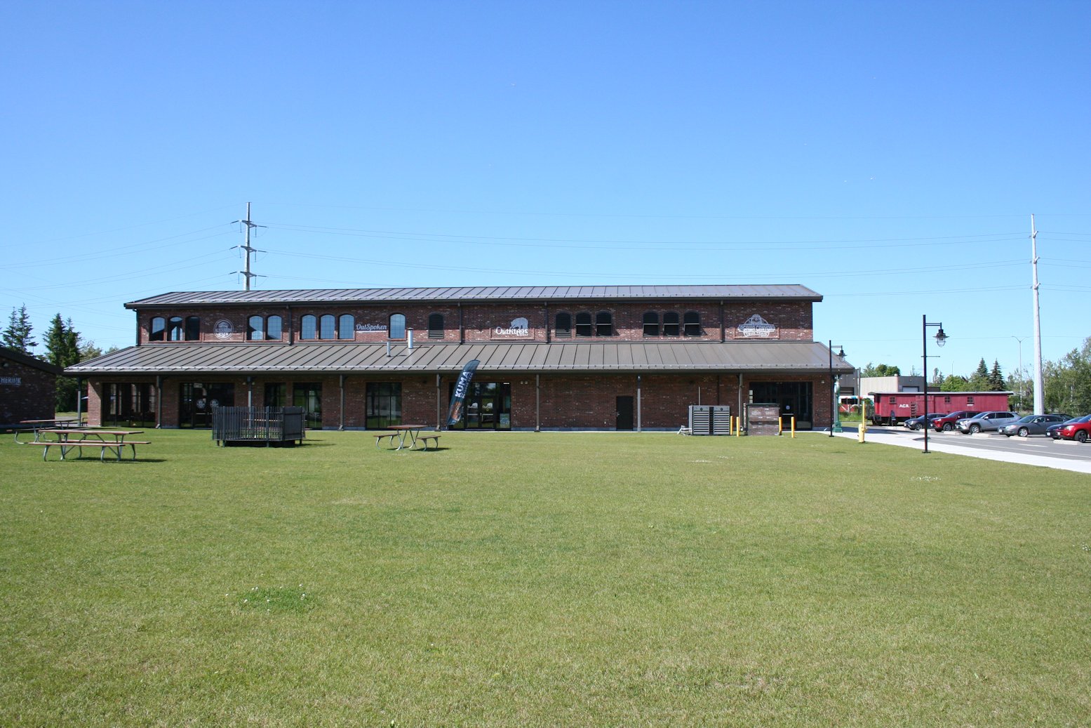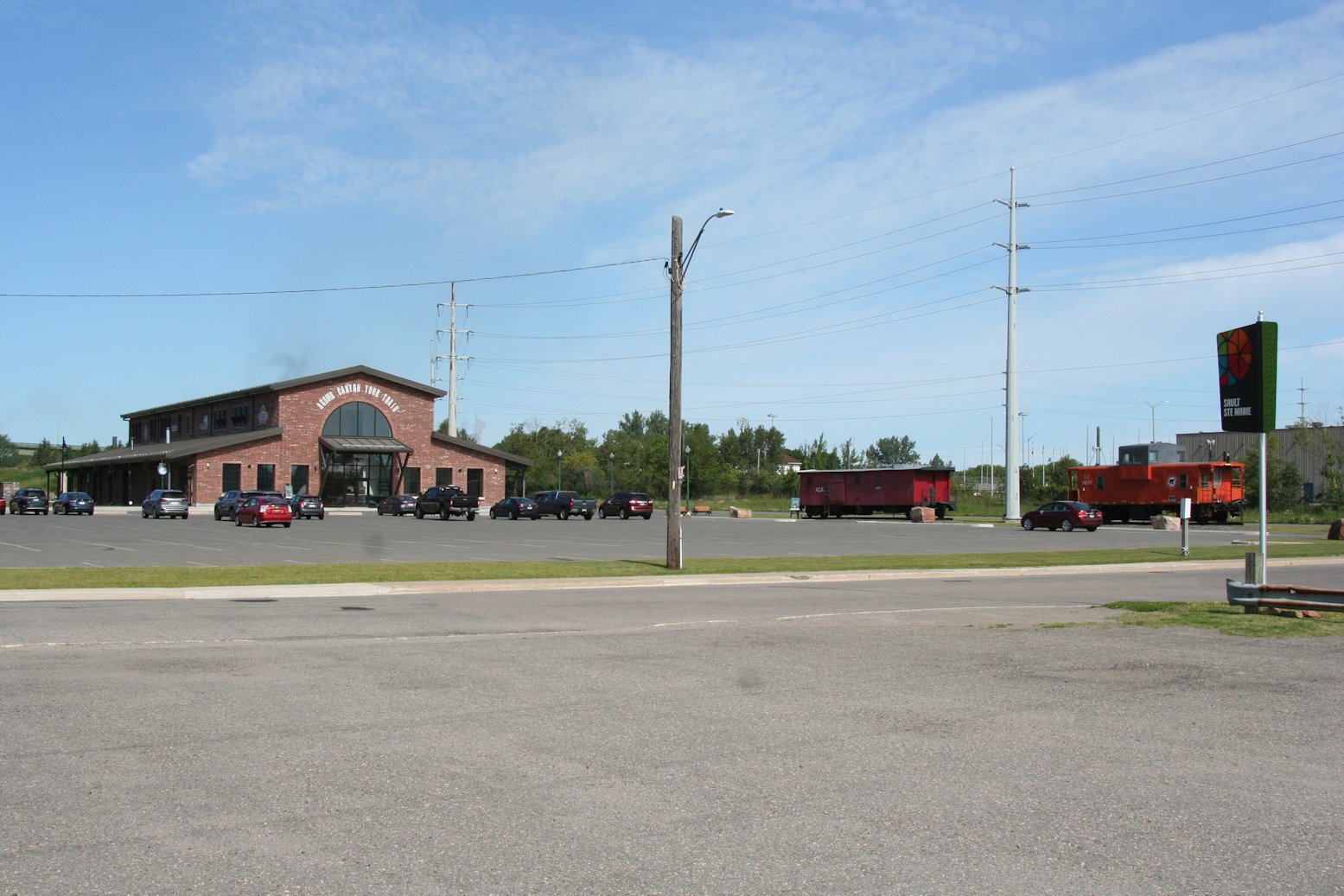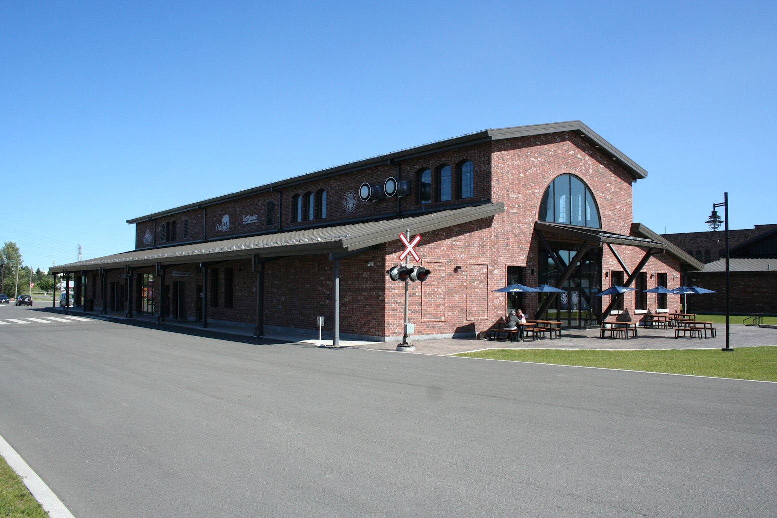 New station building constructed in 2021 for the Agawa Canyon Tour Train. Constructed on the former paper mill property, the new station moves the tour train activity out of the downtown shopping mall, eliminates a couple of grade crossings, and provides separate parking. The new building combines the tour train ticket desk and office, an outdoor sports outfitter store, a micro-brewery, and a restaurant/pub.