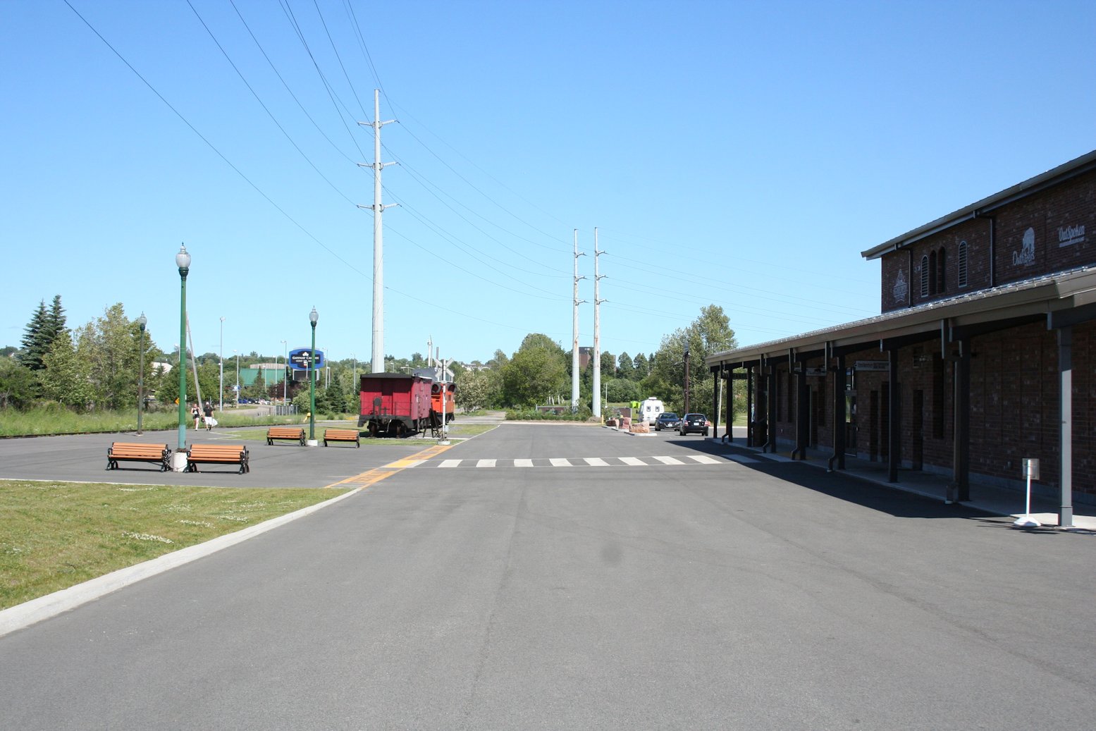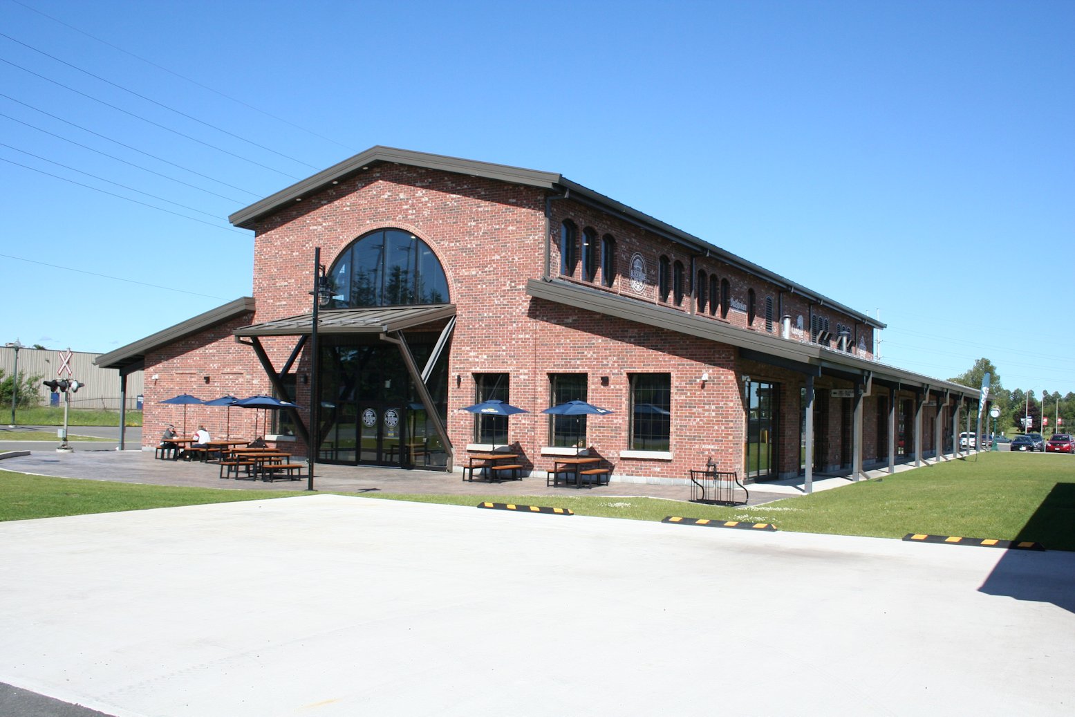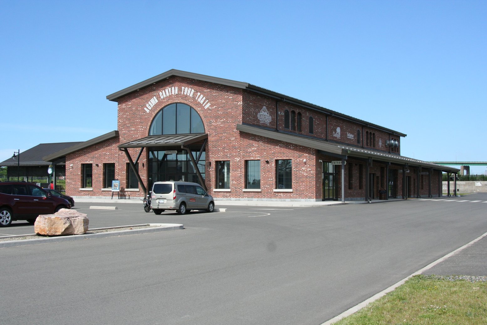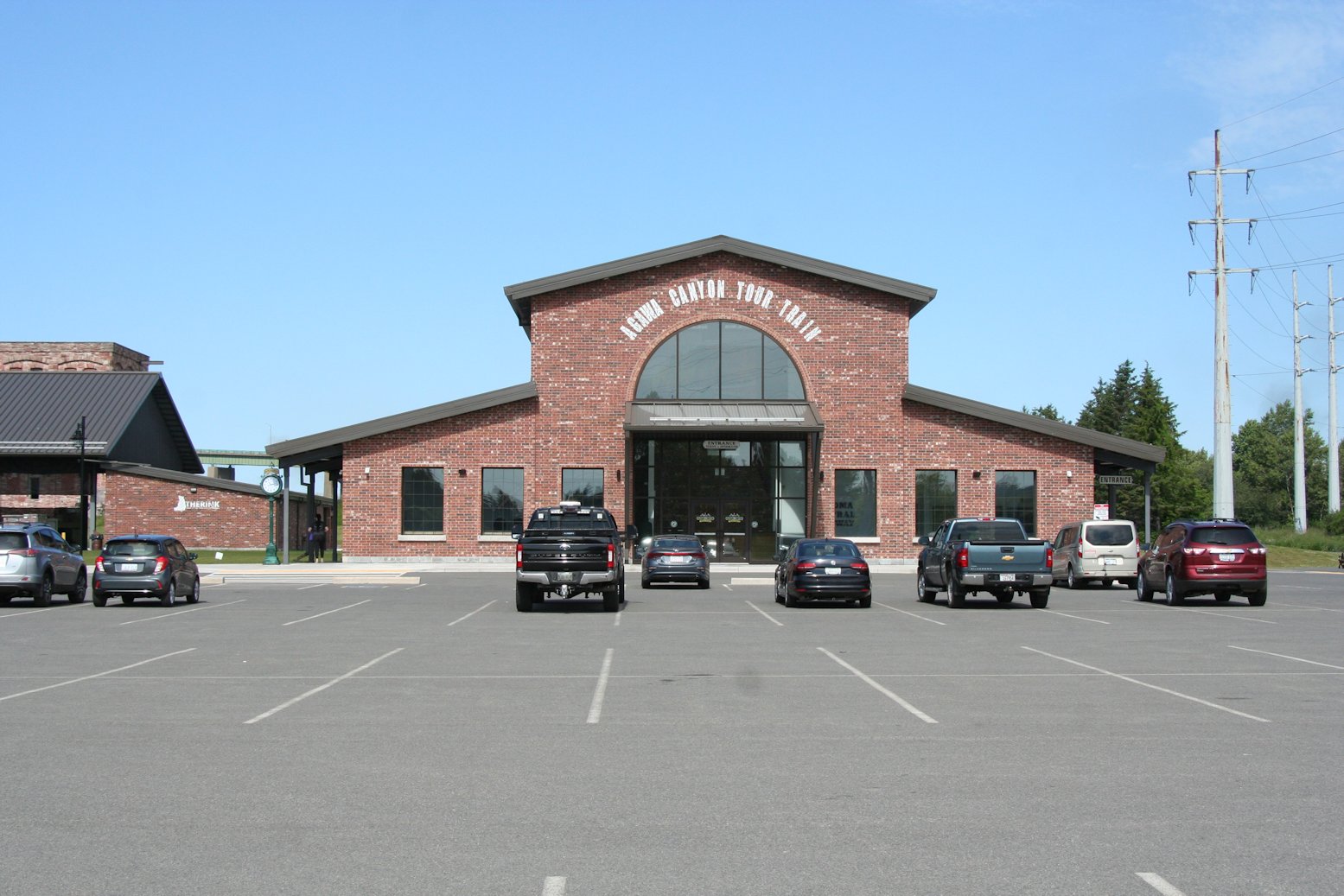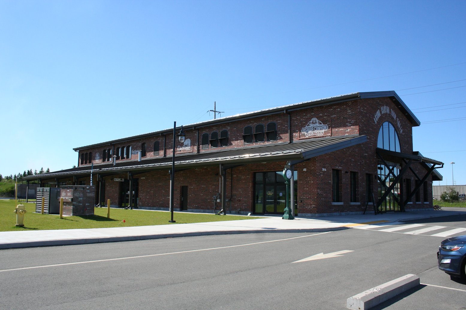 New station building constructed in 2021 for the Agawa Canyon Tour Train. Constructed on the former paper mill property, the new station moves the tour train activity out of the downtown shopping mall, eliminates a couple of grade crossings, and provides separate parking. The new building combines the tour train ticket desk and office, an outdoor sports outfitter store, a micro-brewery, and a restaurant/pub.