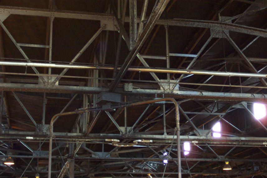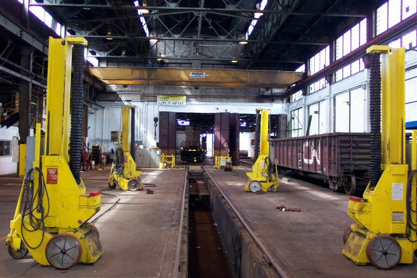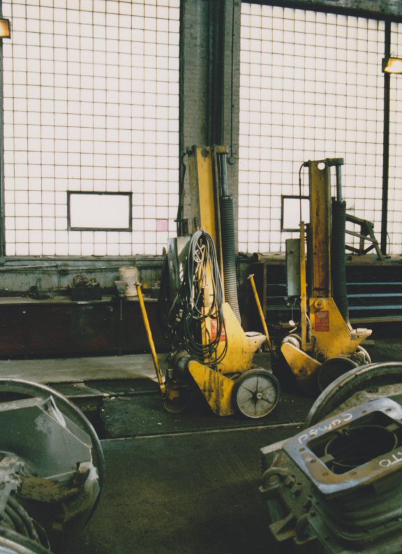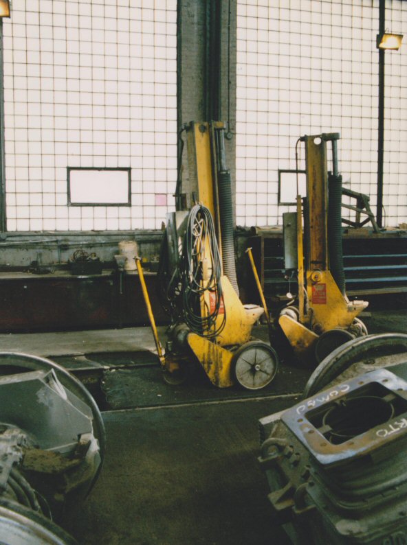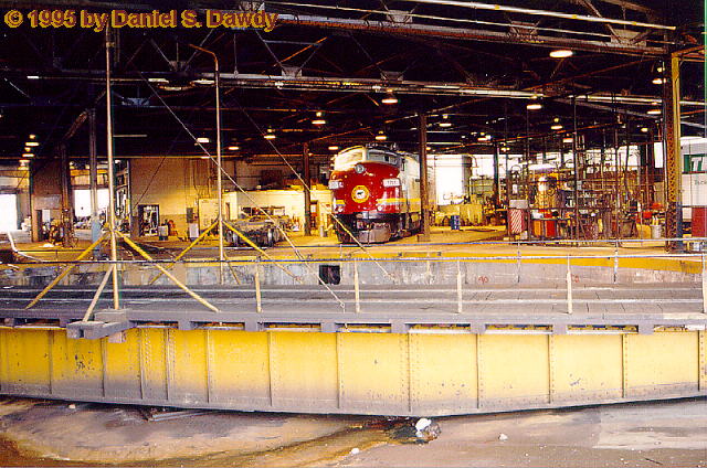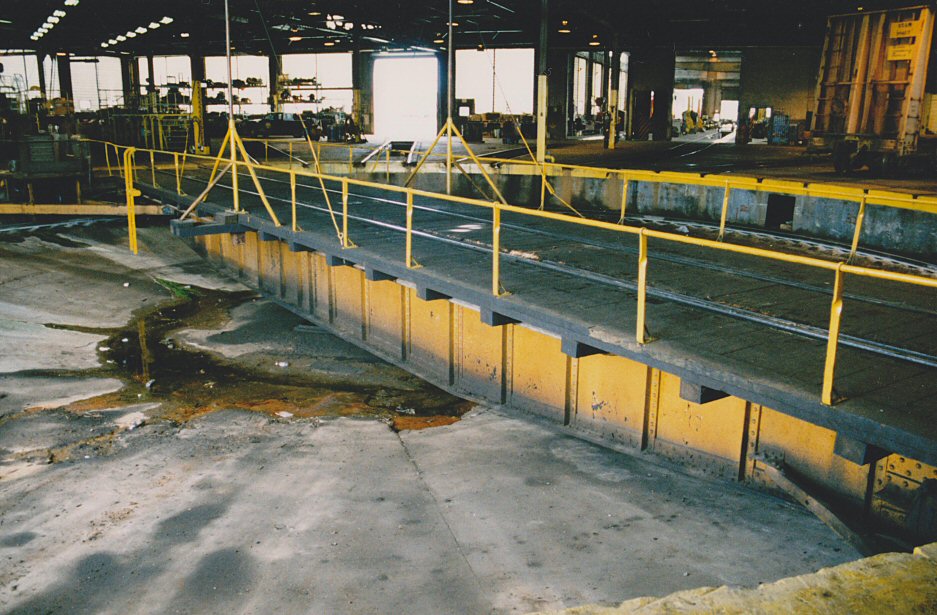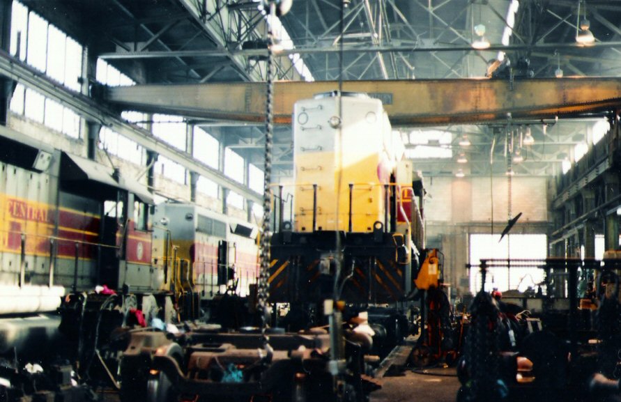 Shop Facilities View of the Steelton shops facilities, looking towards the east. Left to right: main freight sorting yard, scale track, caboose storage track, sanding tower & engine house leads. Main building behind the cabooses and sand tower is the enginehouse, the turntable is actually enclosed inside the building. Building in background far right is the car shops. Top of diesel fuel tanks can be seen behind the cabooses. Steelton c1990s Morgan Turney