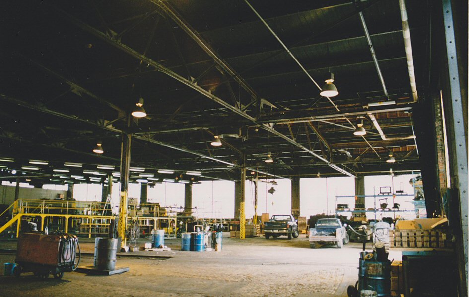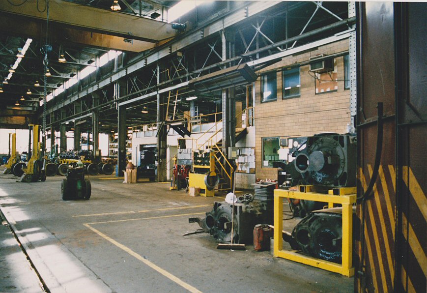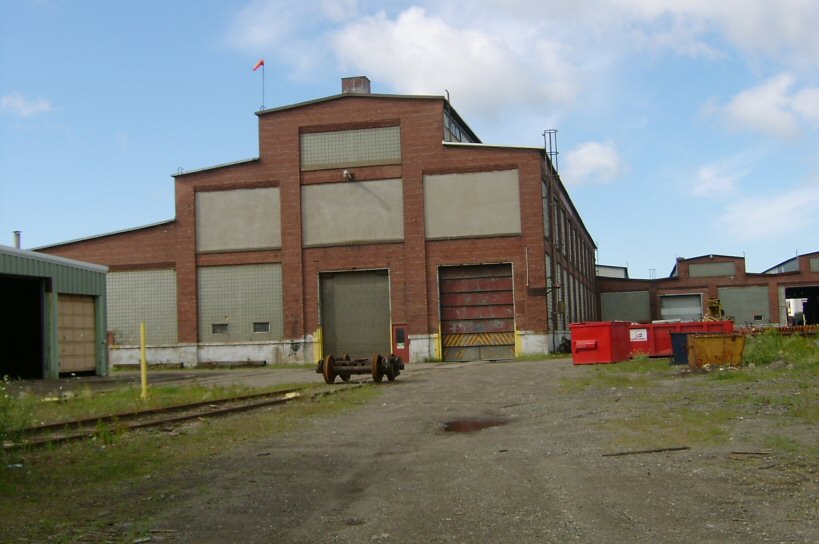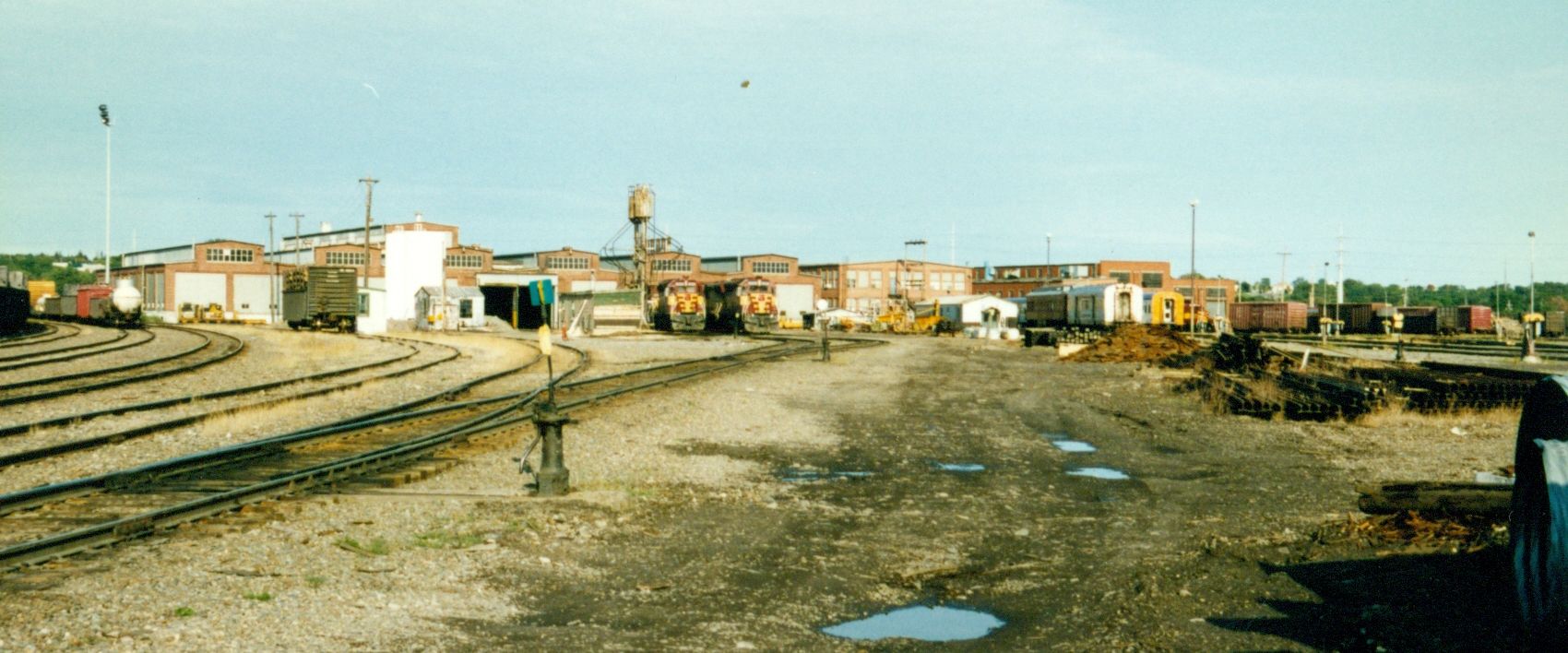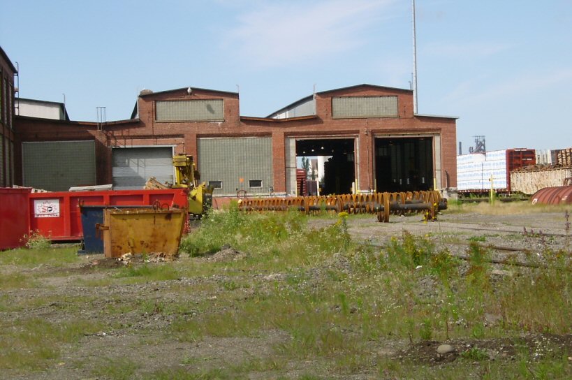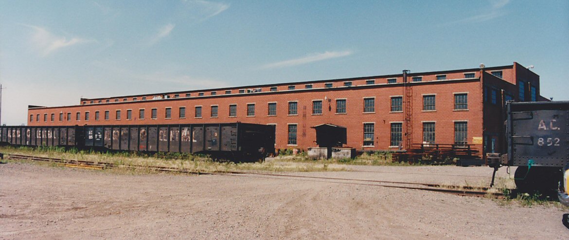 Shop Facilities Another view of the Algoma Central shops complex at Steelton. Main building at centre left is enginehouse and repair shop. Car shops is at far right. 2-story brick building between the engine and car shop buildings is the stores building. The bulkead gondola towards the left of this image is sitting on the ACR's weigh scale. To the left are the main yards at Steelton. Steelton 1996 Blair Smith
