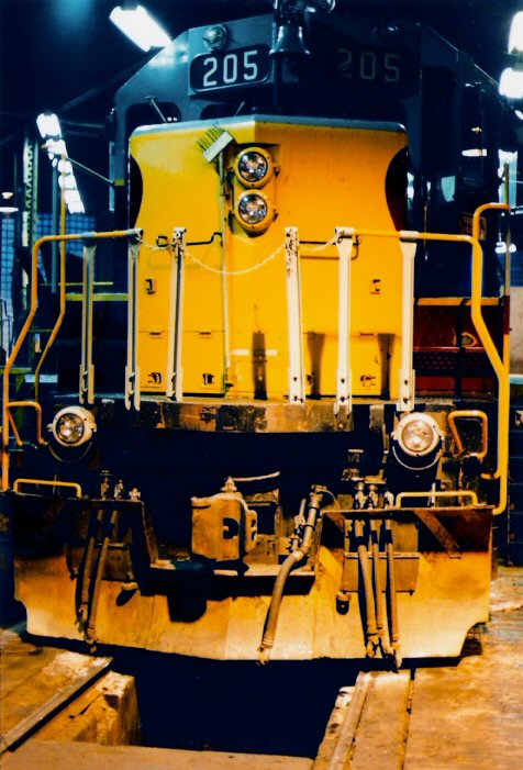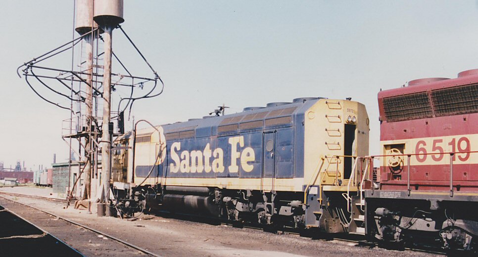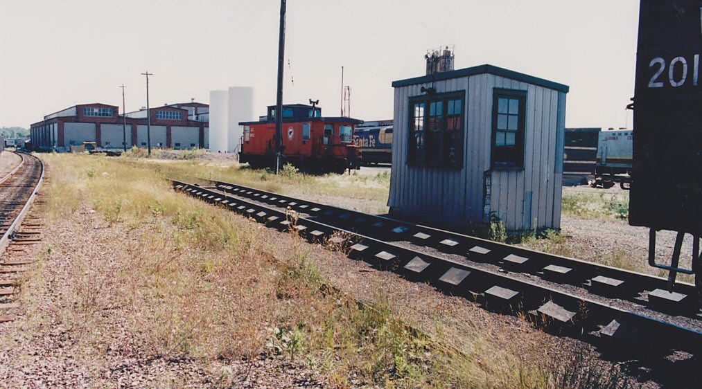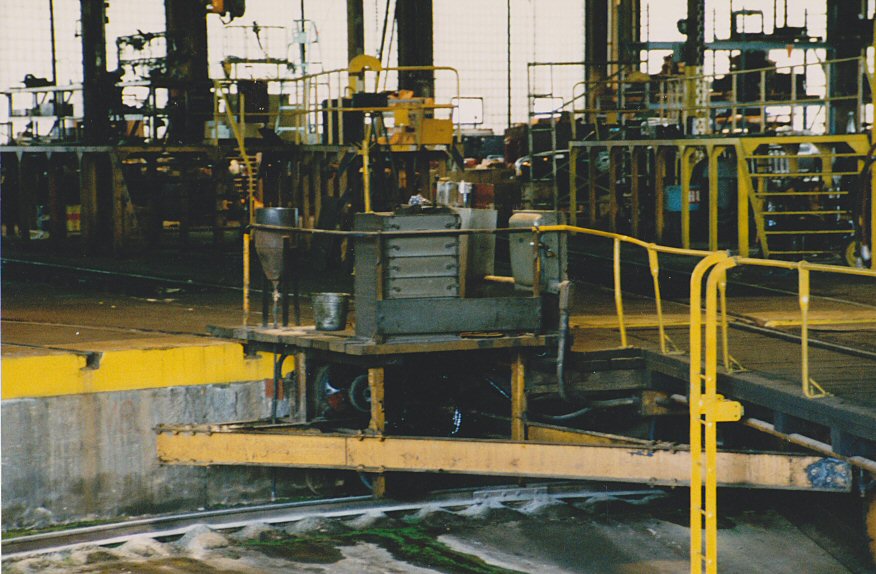 Sanding Tower WC 5972, a former Santa Fe F45 parked on the service tracks at Steelton next to the sand tower and fuel stand. Sault Ste. Marie 1996 Blair Smith