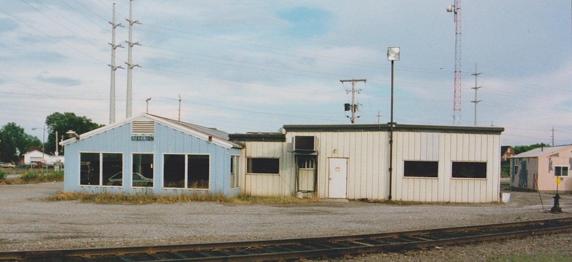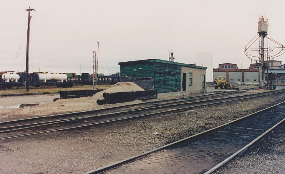 Sand House Sand storage and drying shed at Steelton engine facilities. Sanding tower and approach tracks to the enginehouse are visible at right. Sault Ste. Marie 1993 Blair Smith