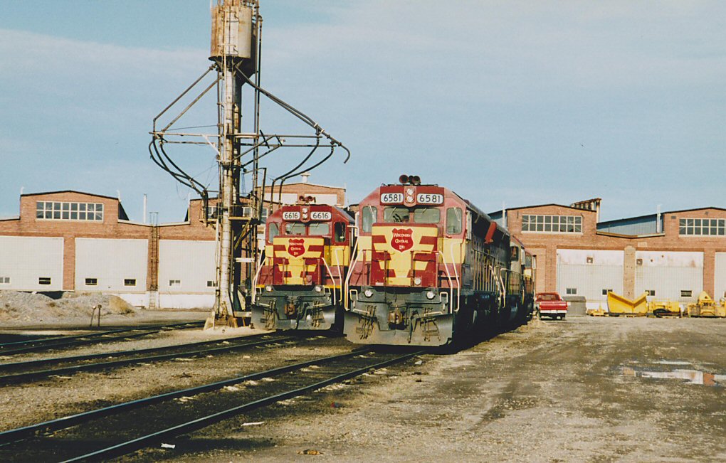 Two more views of the sand tower and servicing tracks, with several Wisconsin Central SD45s standing ready for their next assignments. Sault Ste. Marie 1996 Blair Smith
