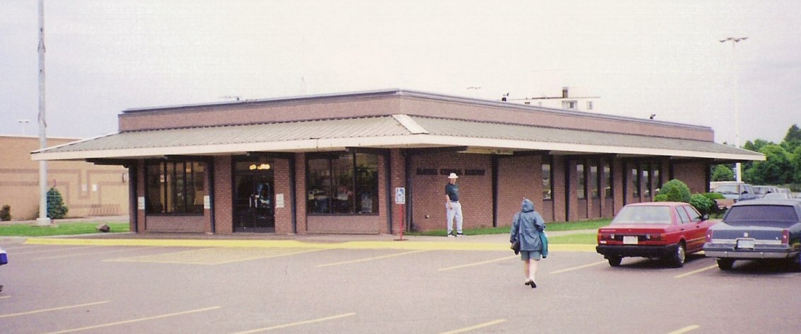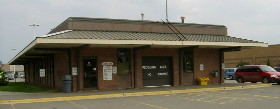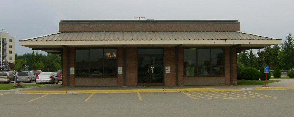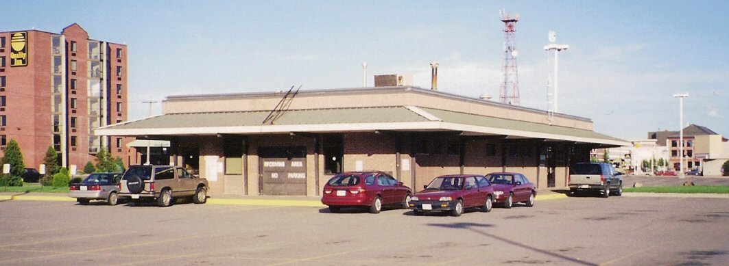 This is the new Sault Ste Marie passenger station, constructed in the late 1970s. The first view shows the main entrance and waiting room side of the building. The track is just to the right of the spot from which the first photo was taken. The second view faces the baggage area of the station, and the track is in the background of the photo. Note at the far right, partially obscured by a corner of the Station Mall, the old 1914 ACR station and headquarters building. (This is now a bank) Sault Ste. Marie 2000 Chris vanderHeide