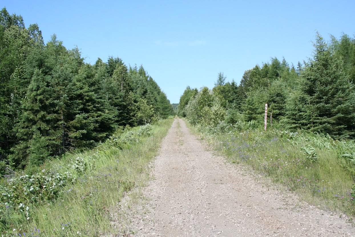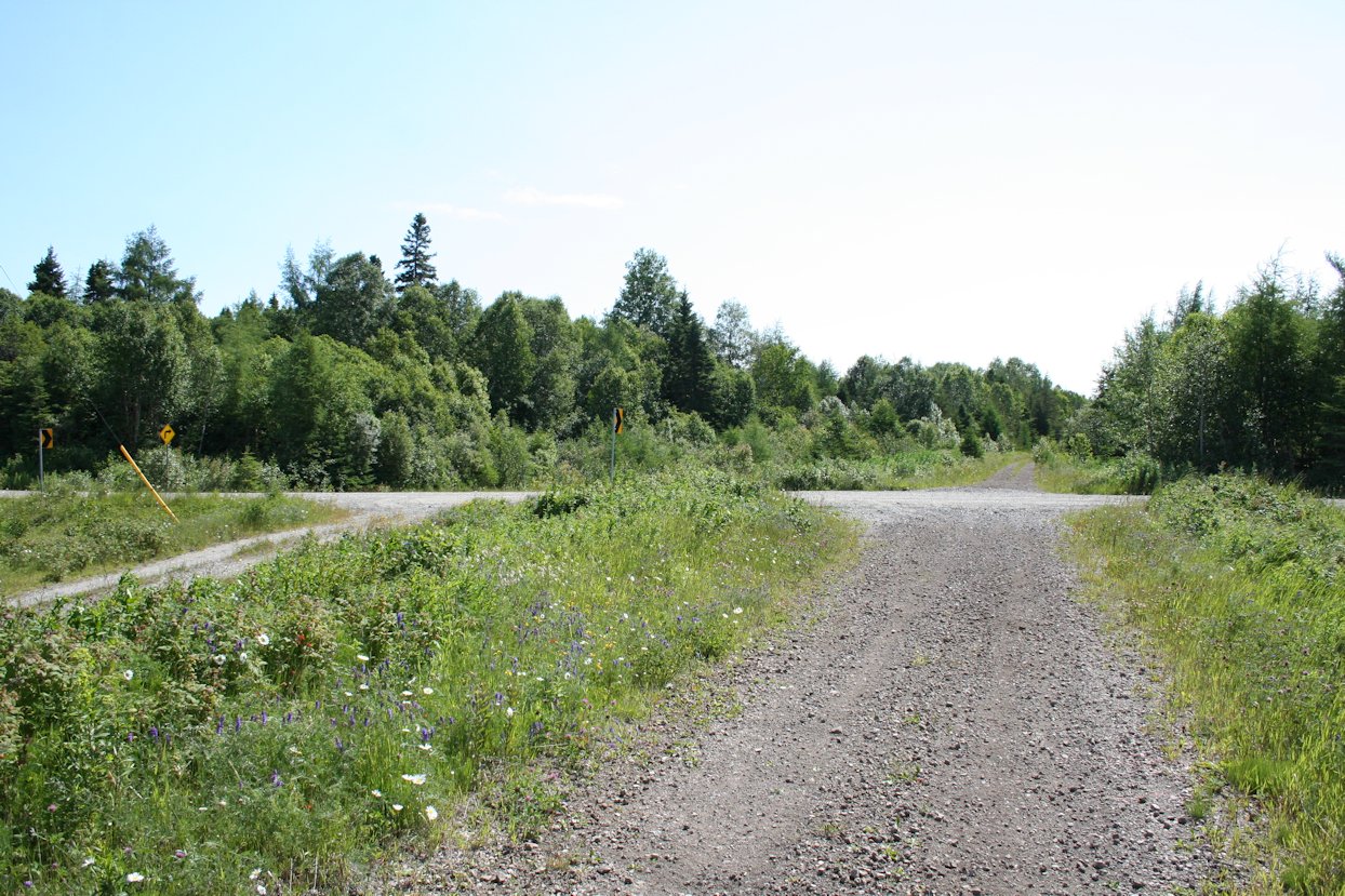 Trembley - abandoned roadbed. First image facing westward at grade crossing; second eastward. Trembley 2015 Chris vanderHeide