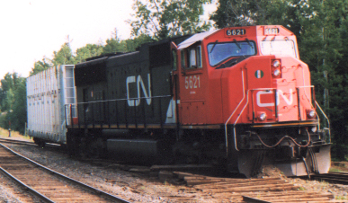 CN 5621 CN SD70i is looking a little unhappy after splitting a switch in the Hawk Junction yard. Hawk Junction 2002 Blair Smith