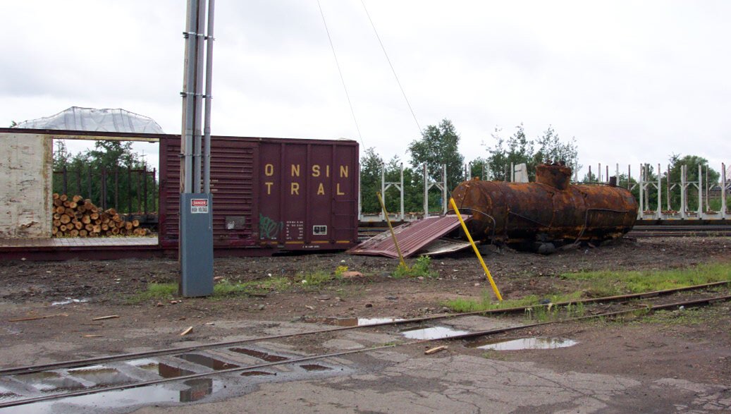 Wrecked Cars A wrecked box car and tank car at the Steelton shops yard. Note the age of the tank cars design. Probably an old OCS water tanker left to rot. Sault Ste. Marie 2002 Nick Masney
