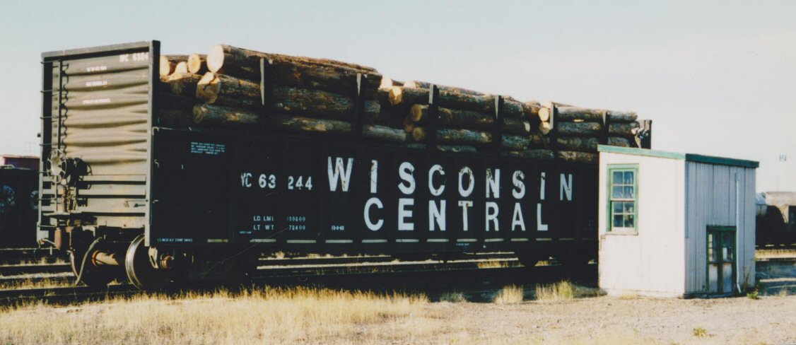 Track Scale WC gondola loaded with logs spotted on the track scale at Steelton, showing the rear of the scalehouse. Sault Ste. Marie 1996 Blair Smith