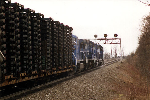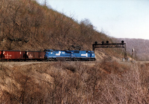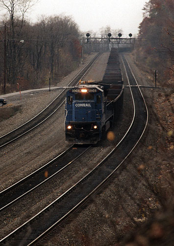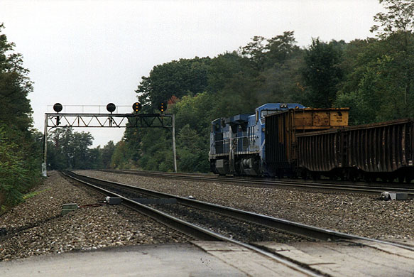 An eastbound freight approaching the Kittanning Point Signal Bridge (Fall 1995)