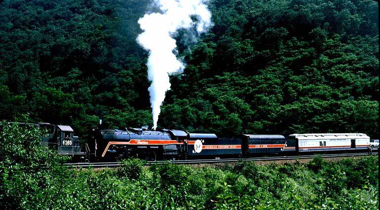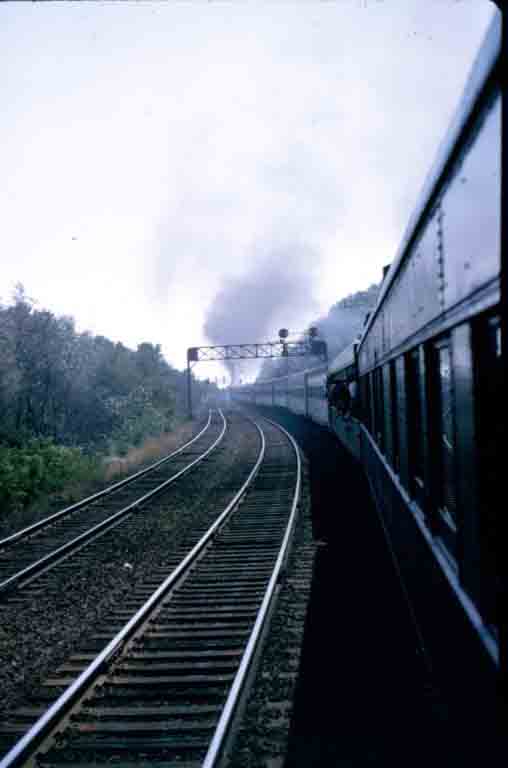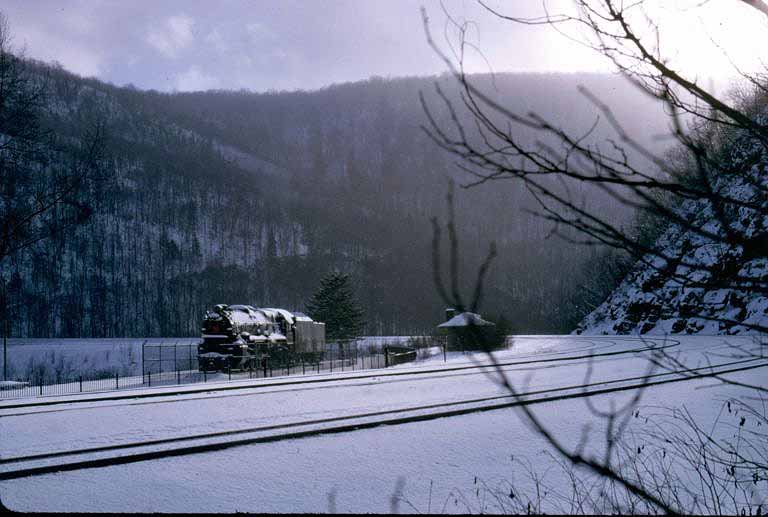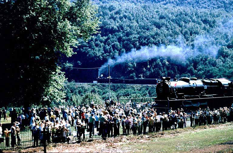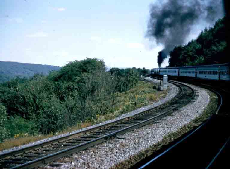 "On this particular occasion, Horseshoe Curve Chapter members were aboard the rear observation car, not in view: They were Raymond G. & Elizabeth Garvin, Paul W. Westbrook, Mary Jo. Wahl, and David Seidel. The occasion was the "first" steam excursion through Altoona and Horseshoe Curve (9-12-1970) since the end of PRR steam in 1957. The Altoona High School band welcomed the train at the station on the westward approach. That's another slide show. The train repeated the experience the following day (Sunday) under cloudy skies, but NKP # 759 handled 18 cars on the mountain unassisted, pulling its consist west through Bennington Curve without one slip of the wheel. No assist from Penn Central." Dave Seidel