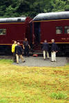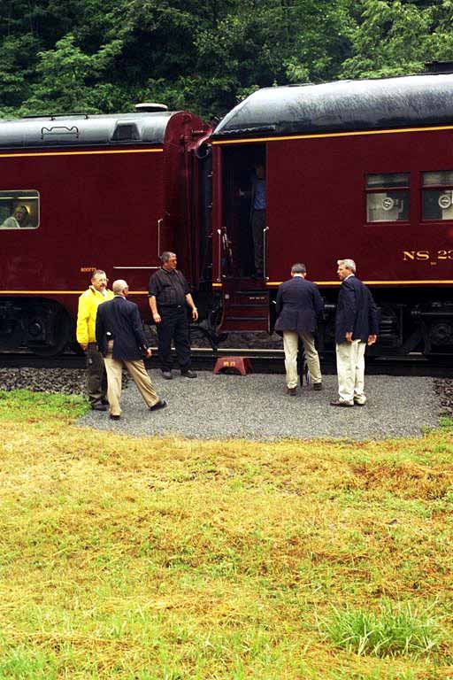 As dusk arrived, the westbound Amtrak 41 (Three Rivers) was about the last, if not the last, regular train to pass through the Curve before rail traffic was stopped for the festivities. NS Chairman David Goode and guests arrived aboard the NS business train on No. 1 track and disembarked, after which the business train moved out of sight. It was powered by two new SD70Ms.