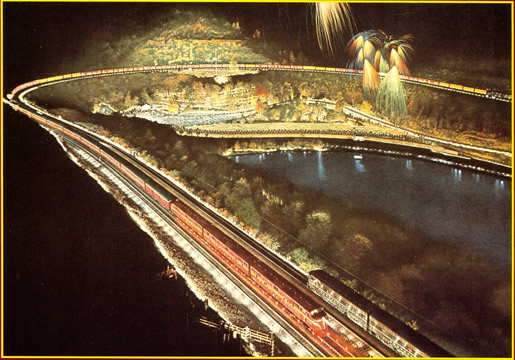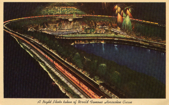 1954 "SYLVANIA Big Shot"To mark the 100th Anniversary year of the opening of the Curve and the 75th Anniversary of the incandescent lamp, the Pennsylvania Railroad and Sylvania Electric Products Inc. cooperated to take the first night picture of the Curve as freight and passenger trains rounded it the night of October 20, 1954. The project to illuminate over 2,000,000 square feet required months of meticulous planning, 31 miles of wiring and more then 6,000 large photoflash bulbs. With a burst of skyrockets lending color to the scene, cameras atop a 150-foor tower recorded the historic flash - the biggest night photograph ever taken. (William Burkett)
