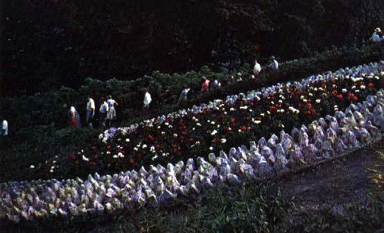 From the December 1954 issue of "The Pennsy", here are some notes from the original event on October 20, 1954... "Executed at 10:53 p.m. Setup began in September, including construction of a 157 foot tower for the camera. 6,000 six foot stakes were cut to hold the lights, and 12,000 pie pans were used as reflectors. More than 100 state and local police were on hand in case of trouble, as were several fire departments. Three trains were staged for inclusion in the picture. "At the east end on No. 2 track was a special freight train with a consist of newly-painted box cars. At the opposite end of the curve, directly below the camera tower on No. 1 track, was a three unit diesel. The center of the attraction, however, was the third train, No. 49 -- 'The Trail Blazer'. This New York-to-Chicago streamliner had been washed by the car-cleaning gang at Sunnyside Yard, N.Y. until it gleamed. Enroute toward the Curve PRR publicity men handed all the passengers a special leaflet explaining the picture-taking and inviting them to help celebrate the Horseshoe Curve's 100th birthday in the dining car where a huge cake, baked by the chefs at Sunnyside Commissary, was to be served." "In the publicity department's temporary press headquarters at the base of the Horseshoe more than a dozen reporters waited by telephones to relay results of the flash to newspapers and wire services." "TWENTY SECONDS!" "Two hundred and fifty feet above the track, atop the special camera tower, Mr. Mutschmann and four Sylvania photographers stopped shivering in the cold and began opening shutters on their black-and-white, color, stereo, and movie cameras." "TEN SECONDS!" "Hundreds of spectators on the ground below craned to peer over the huge area." "FIVE SECONDS!" "On the special platform near the tower Sgt. T.C. Ketenheim of the PRR police shouted out the count to the 150 guests as it came to him by telephone." "FOUR!" Radio listeners in Altoona heard the second-by-second 'count down' in a direct broadcast by station WFBG." "THREE!" "More camera shutters were opened as the 34 press photographers on the guest platform, who had come from all over the East and as far away as Seattle, Wash., prepared to take their own pictures." "TWO!" "Altoona's Mayor Walter H. Grove stood tensely beside a small red button which would set the whole thing off." "ONE!" "Mayor Grove raised his finger." "ZERO!" "The flashbulbs went off with a rippling wave of light. In just 1/15 of a second -- faster than the blink of an eye -- Horseshoe Curve was imprinted on film. The resulting photograph, now already see in hundreds of newspapers, on television, in LIFE magazine, and many other publications..." submitted to PRR Talk, 4/2/04, by (unknown)