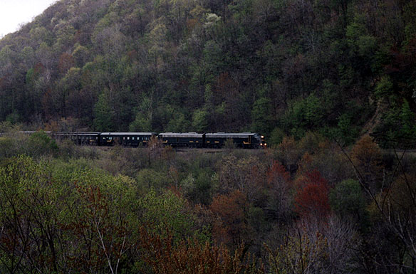 The Conrail Office Car Special (near McGinley's Curve) is Eastbound toward the Horseshoe Curve on 4/24/1998