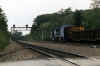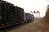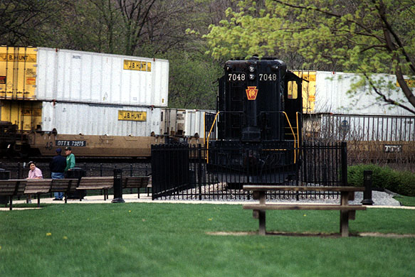 An Eastbound Intermodal Train traverses the curve. Meanwhile, PRR GP-9 #7048 quietly watches on. 4/24/1998