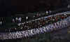 The rain cleared about a half-hour before the light show began. The light train was held just out of range until the program began, when the train moved westward on No. 2 track at about 5 mph to the accompaniment of live music. The train stopped with the boxcar at the apex of the Curve. The engines and boxcar had their own individual side lighting, and the nose of the 9822 was also illuminated with lamps that changed brilliant colors. The light show, which lit up the mountainsides in all directions, continued for several minutes until a 30-minute fireworks show began. At the conclusion of the fireworks, the NS business train returned to gather its passengers, and the light train began to return down the mountain to Altoona.