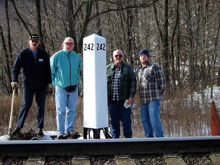 Thank you to Ernie McClellan, Assistant Superintendent, and Boilermakers Rick Massaro, Joe Chirdon, Jeff Rupp, and Dan Woomer; Vince Laratonda, Gang Leader, and the Juniata Shops for manufacturing the new milepost. Chris Carney, Assistant Division Engineer, Bill Little, Track Supervisor, Rick Rabish, Foreman, Bill Durbin, Machine Operator, of the Pittsburgh Division Maintenance Of Way & Structures Department for site preparation, and thanks to Nick Seman for computer graphic work for the numerals. A special thank you to Frank Givler for taking delivery of the milepost, providing a facility to store it during paint and finish work, and transporting it to the installation site.Keystone Restoration and Preservation is a not-for-profit corporation for historical and educational purposes to restore, preserve, exhibit and operate historically significant railroad equipment and properties. KR&P had a significant volunteer presence in the 1986-87 restoration of former PRR K-4s Class steam locomotive# 1361, and provides operational crew for that endeavor. KR&P has also restored the amusement park steam locomotive for DelGrosso Park, Tipton, PA, owns historical railroad cars and equipment, and engages in various rail-heritage related projects, which often has included assisting the mission of Railroader's Memorial Museum, Altoona, PA.Installation of Mile Post Marker 242 was performed by Keystone Restoration and Preservation members