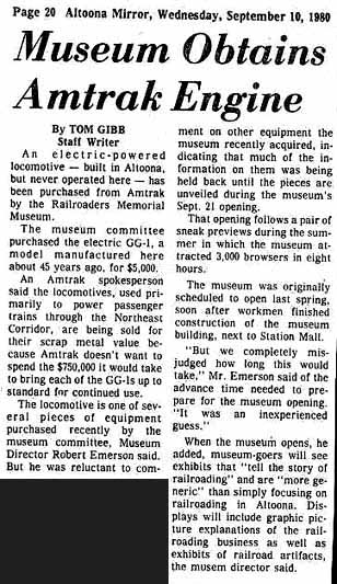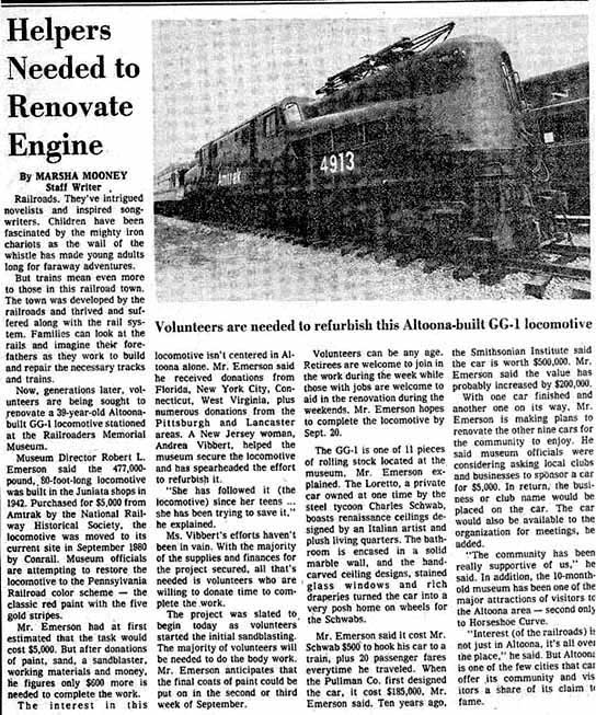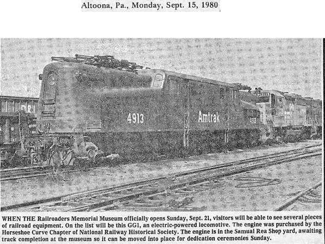 PRR GG1 #4913 is owned by the Altoona Railroaders Memorial Museum.