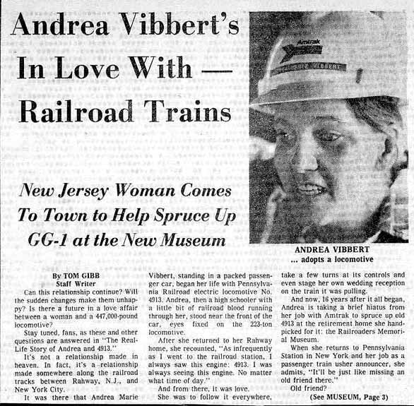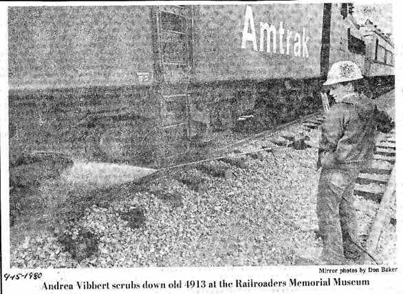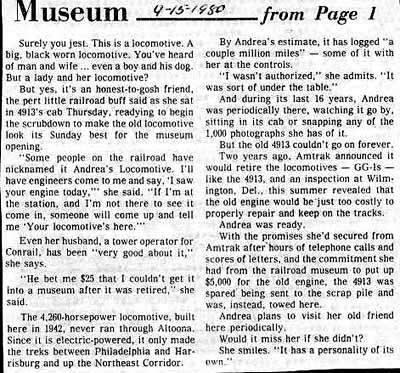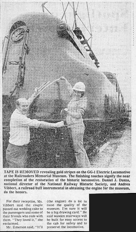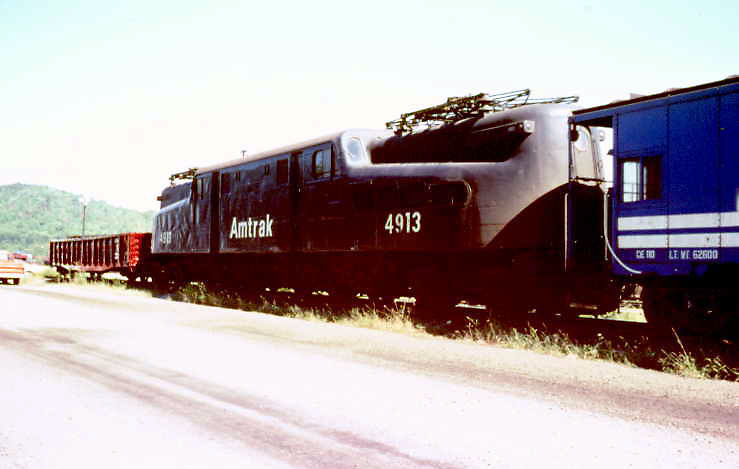 According to Don Ross, #4913, was built as a Class GG-1, General Electric, at the Altoona Works (Juniata) in January 1942. It was a one of six GG1's repainted tuscan red in 1952 for use with the stainless steel cars used on "The Senator" and on the "Congressional Limited". It became Penn Central 4913, Class GG-1 in 1968. Then it became Amtrak 913 in March 1973. It was renumbered back to 4913 in June 1979. It was restored as PRR 4913 after retirement.Andrea Vibbert of Avenel, NJ, located this locomotive and and contributed the initial $1000 of the purchase price. The Chapter contributed the remaining $4000 toward the purchase as well as raised $5000.00 to sandblast the black Amtrak GG-1 and repaint it to 5-stripe PRR Tuscan red.