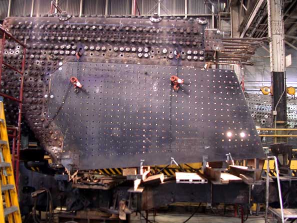 .....After Final Drilling, The Bottom Of The Sheet Will Be Cut To Size, The Sheet Will Then Be Mounted In Place In Preparation For The Inside Sheet Installation. With The Light Behind The Sheet, One Can Clearly See All Of The Newly Drilled Stay Bolt Pilot Holes.