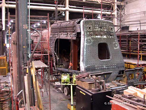 Newly Formed and Drilled, Fireman’s Side, Firebox Side Sheet Is Held In Place For The Final Markup Of The Rivet Holes Along The Mud Ring. Close Observation Shows The Front Edge Of The Sheet Has Just Been Formed Using A Torch And Sledge Hammers Near The Lower Left Corner Of The Sheet.....>