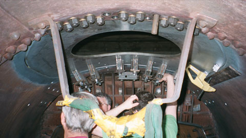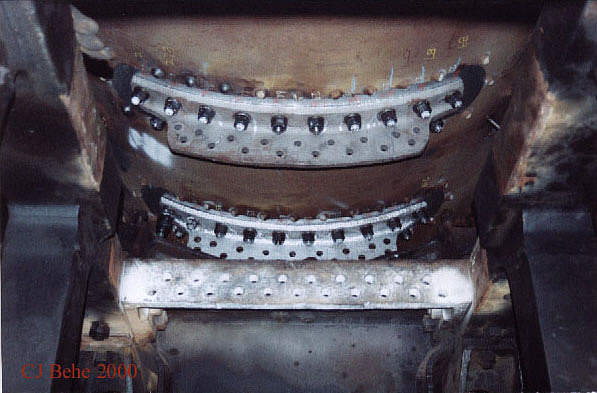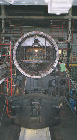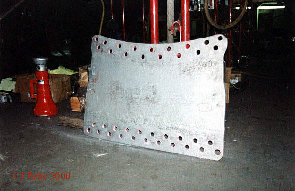 Work on the left "mud ring" is complete. The right one is half done. The steam dome patch is installed and ready to be welded. The front tube sheet is patched but needs installed. The backhead is drilled and riveted but has not yet been installed (due to the steam dome patch not being welded). The boiler check pads have been manufactured. Regarding the flexible stay bolts, the caps are on but there are a few that need more work. Both piston valves have been pulled however the pistons have not yet been pulled. Nothing has yet been done regarding the axles or driving mechanism. Many new rivets, bolts, and studs have been manufactured, cut, threaded, and installed. The following still needs done (as reported in February 2000):