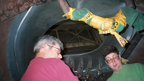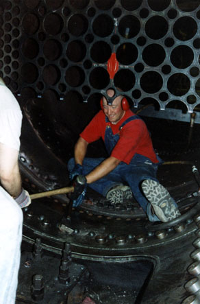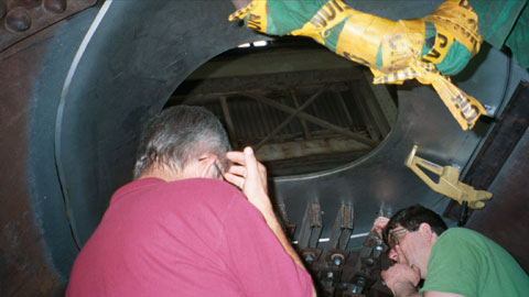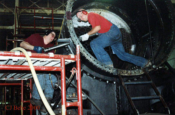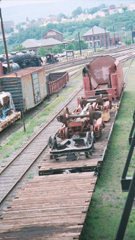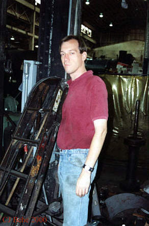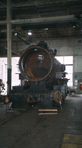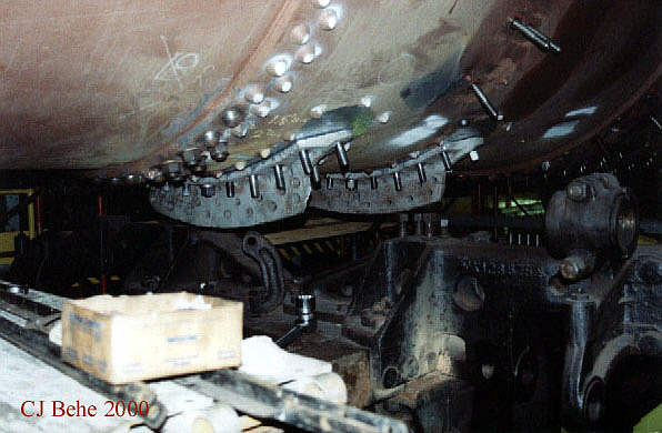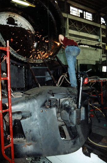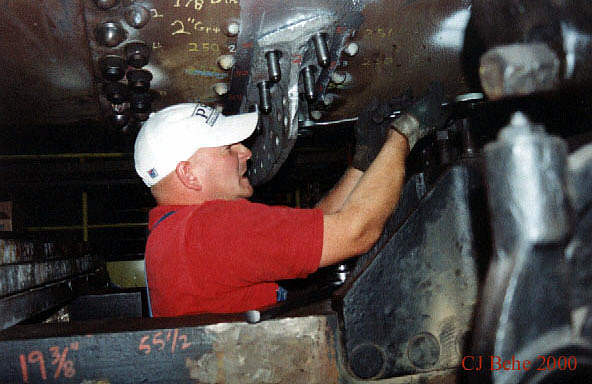 While we were working on the locomotive, the Park Service's tour guides would bring groups of tourists through the shop. This did not interfere with the work. Again, the biggest problem that I forsee is a lack of workers. One person alone could not have installed the T-irons. There about three left to install yet. Jeff does not recall any volunteers from the Altoona area going up to assist with the work. Most of Steamtown's volunteers are from the area surrounding Scranton. You do not have to have prior locomotive restoration experience to help. Just have a set of old clothes, a little bit of strength, some mechanical ability, and the ability to follow directions. Brian and I figured that it would be best to stay overnight and work at least two days...to justify the driving time. That is exactly what we did. It also allowed us to an extra day of work. I would have liked to have stayed another day but there were no vacancies in the hotels Saturday night due to students arriving at the local universities. If you wish to volunteer, either contact Steamtown directly or email me an I can get you in touch with the appropriate persons. (by Chris Behe, posted 8-21-00)
