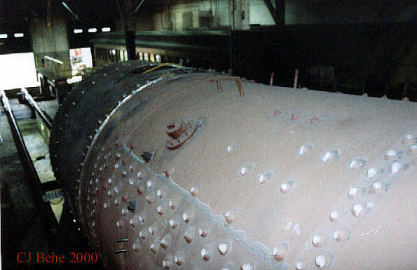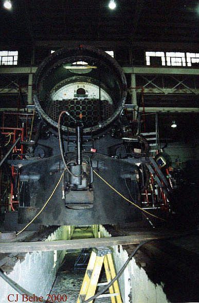 Front end. New smokebox as well as the steam chest and drop coupler are in place. Jeff Miller is seen working off to the right of the photo. Photo by Andy Mulhollen. 6/9/00 Front end. New smokebox as well as the steam chest and drop coupler are in place. Jeff Miller is seen working off to the right of the photo. Photo by Andy Mulhollen. 6/9/00 L-R: Logrando, Price, Charlesworth, and LaMorte. Photo by Andy Mulhollen. 6/9/00 Rear view minus the backhead. Photo by Andy Mulhollen. 6/9/00 Tender shell and undercarriage and locomotive trailing truck on flatbeds outside along the mall ramp. Photo by Andy Mulhollen. 6/9/00 Tender shell and undercarriage and locomotive trailing truck on flatbeds outside along the mall ramp. Photo by Andy Mulhollen. 6/9/00 Tender shell and undercarriage and locomotive trailing truck on flatbeds outside along the mall ramp. Photo by Andy Mulhollen. 6/9/00 Front end view. Photo by Andy Mulhollen. 6/9/00 Inside the boiler looking up and back at the steam-dome patch that everybody is talking about. It is ready to be welded in place. Right now they have to send welding samples out to be tested to...I believe to the FRA. If they pass, Jeff can begin welding in the patch. I am in the front of the boiler looking back toward the backhead. that is Jeff miller in the green and also Dick charlesworth. Photo by Andy Mulhollen. 6/9/00 Inside the boiler looking up and back at the steam-dome patch that everybody is talking about. It is ready to be welded in place. Right now they have to send welding samples out to be tested to...I believe to the FRA. If they pass, Jeff can begin welding in the patch. I am in the front of the boiler looking back toward the backhead. that is Jeff miller in the green and also Dick Charlesworth. Photo by Andy Mulhollen. 6/9/00 Same. Photo by Andy Mulhollen. 6/9/00 Steam-dome patch from above the boiler. Andy was way up on the scaffold. Anything for the betterment of the chapter you know. Photo by Andy Mulhollen. 6/9/00 Machinist making studs for the boiler. They will hold on the external sheeting as well as the ash-pan and other appliances. Photo by Andy Mulhollen. 6/9/00