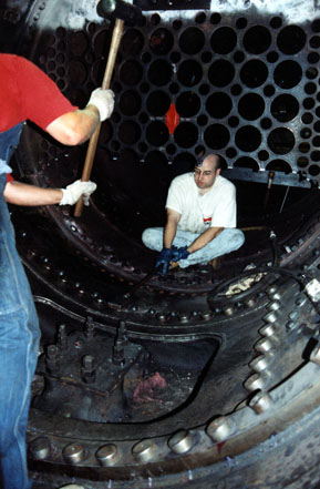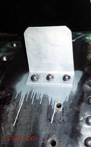 My first task was to take the studs (about 40) to a parts cleaner to get the oil off. A second cleaner was then sprayed on them afterwards. While I was doing this, Brian had to brush high temperature sealant into all 40 holes on the boiler that we would be working with. A messy and sticky job. We then took eight studs (four for each T-iron), brushed more sealant on their threads, and installed them in the boiler. Brian and I lifted the T-irons into place while Jeff aligned them with the studs and secured them in place. Afterwards, Brian and I finished placing sealant on the remaining studs, installing them and securing the T-iron to them. This took most of the day and we quit work at around 5 pm. Jeff planned to do riveting on Saturday.
