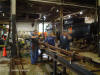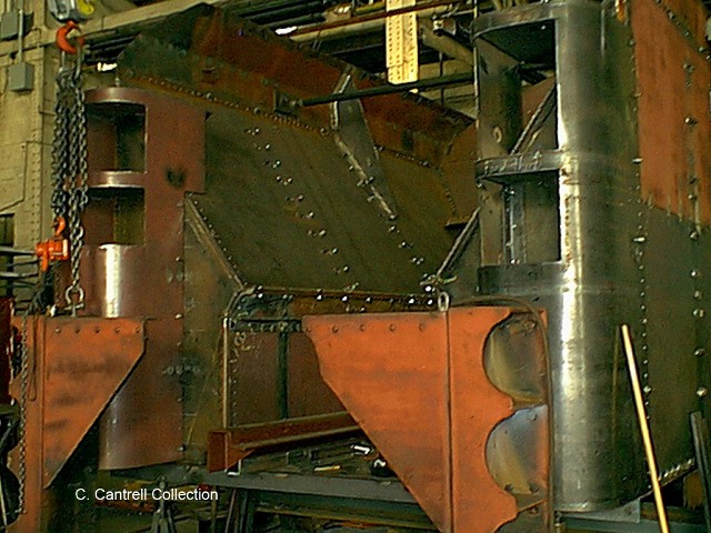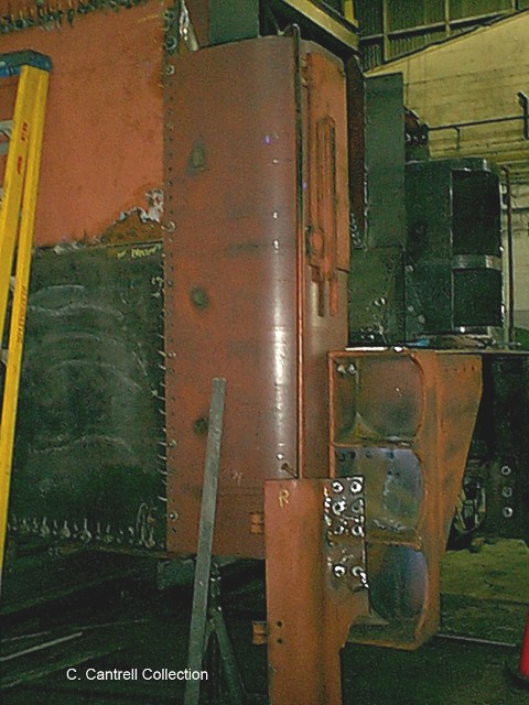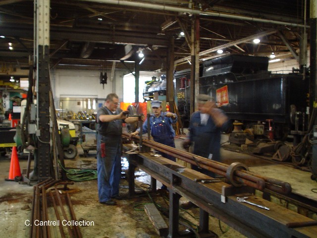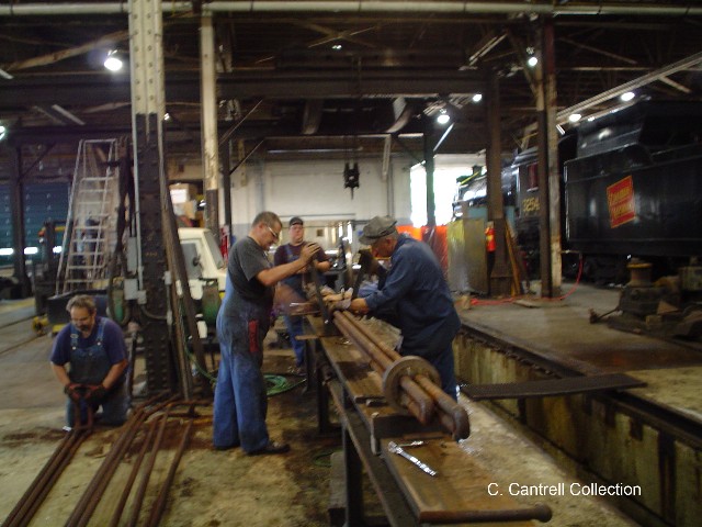 84. Volunteers Walter Elvidge, Chad Frederickson, and Charles Cantrell assisting contractor Bill Frederickson in banding the superheaters. Altoona employee Mike Tillger is removing cinder guards and old bands prior to rebanding. |