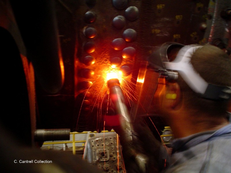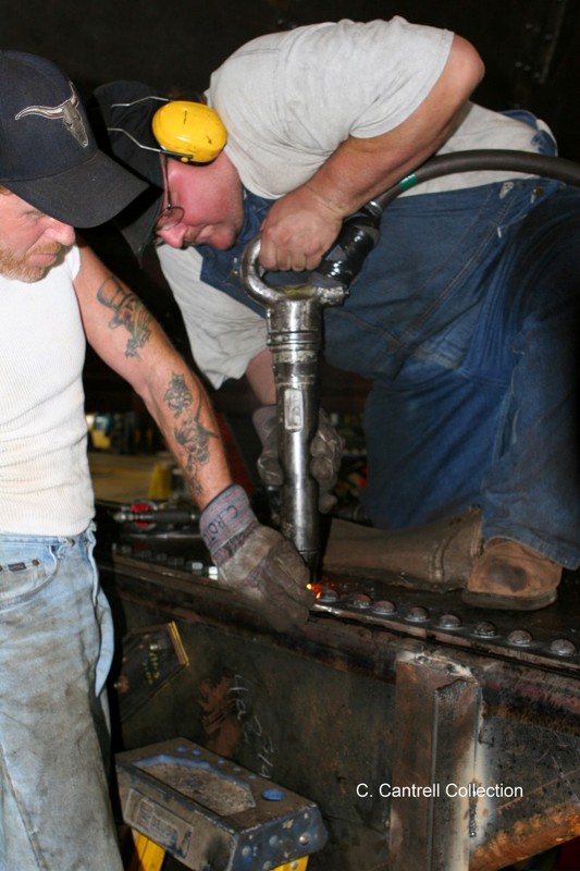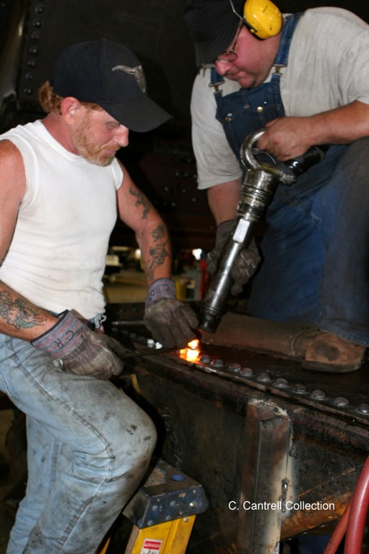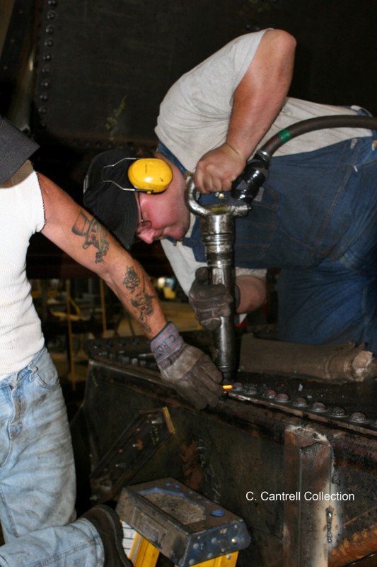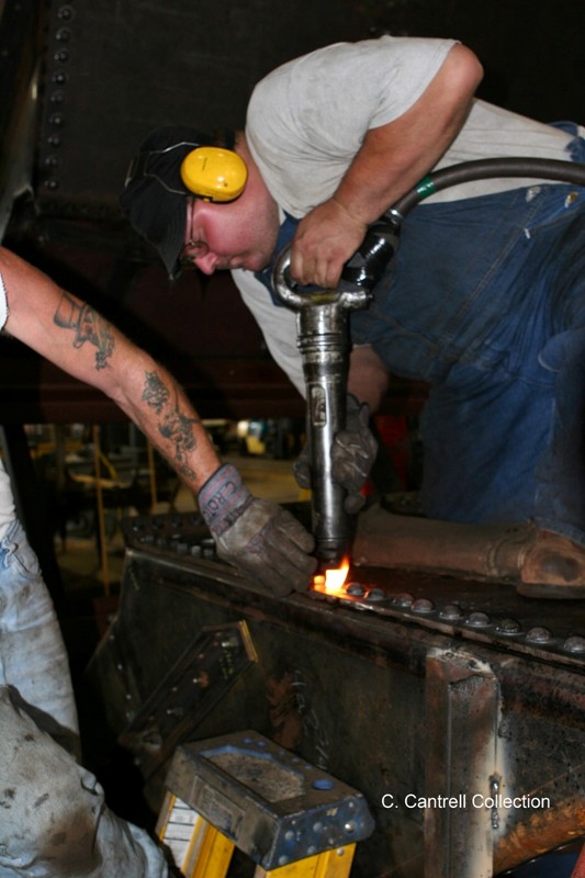 1. As riveting begins on the locomotive, Jeff checks to see if the rivets are ready. |