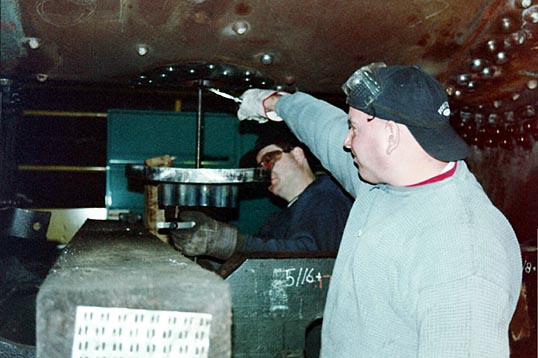 On Wednesday, April 4, 2001, I stopped in at Steamtown. I spoke with Jeff Miller. He advised that he had finished grinding the left inside portion of the firebox that I had been working on previously. Also, as planned, the K-4's drive axles had been shipped to the shops of the Tennessee Valley Railroad Museum. On 4/9/01, Steve Freer of the TVRM wrote: "You can see photos of the 1361 wheels in East Chattanooga Shop by going to http://www.tvrail.com then going to "Bulletins" then "latest news".....or skip jumping through hoops by going directly to http://www.geocities.com/tvrm_classicsteam . There is one shot on the current update page and a better one on the previous update (link on bottom of page)."
